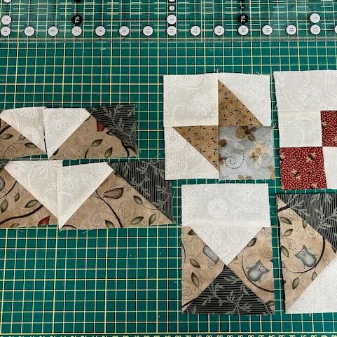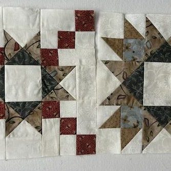 I started with lots of squares and made the chain rows, and smaller squares and half-square triangles for the stars and viola, I have 2 blocks.
