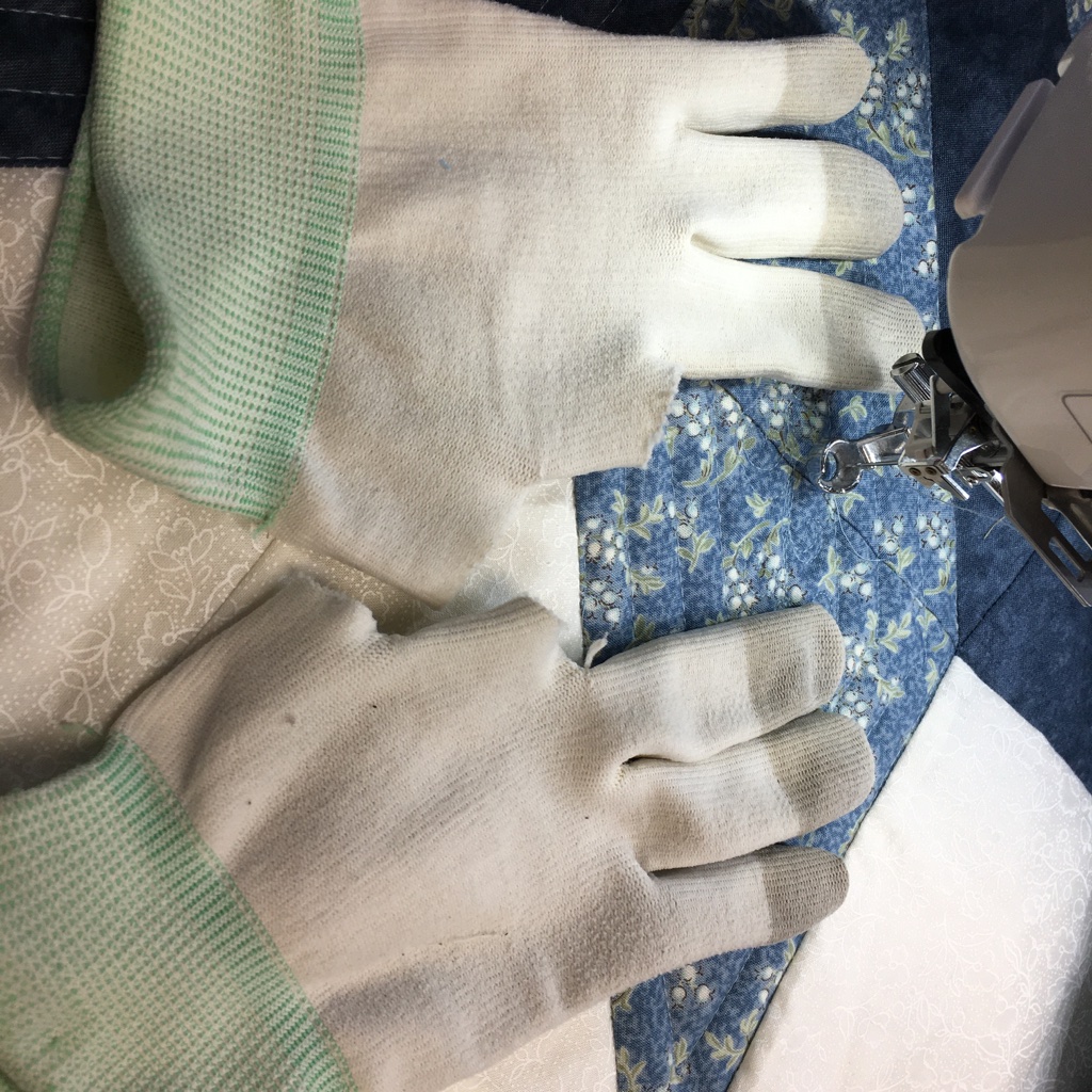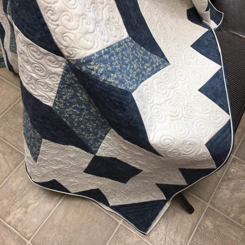 The tumbler quilt that I started in July received the final stitching of the binding as we Zoomed! When quilting this quilt, I practiced ruler quilting. I used Silly Moon’s Turkey ruler to do the waves across the quilt. With how inconsistent I am, I made sure that the ‘waves’ were all started in a different spot. That way, you wouldn’t notice the one or two waves that were different! ~grin~