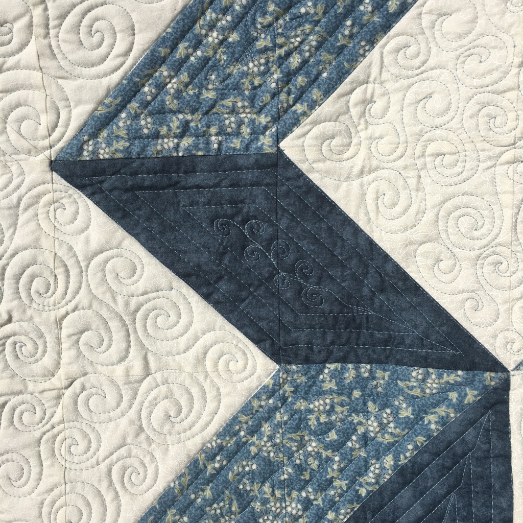 And do you see that skinny border? Last month, Terry (my cousin I was zooming with) had shown us this cute little flower that she uses in a skinny border. Of course, at the time, I didn’t draw it out … so when I was quilting this border, I attempted to do it. It was a fail … but a GOOD fail …. I came up with this bow with ribbon between it … how sweet is that? Don’t you just love it when things like that turn out?
