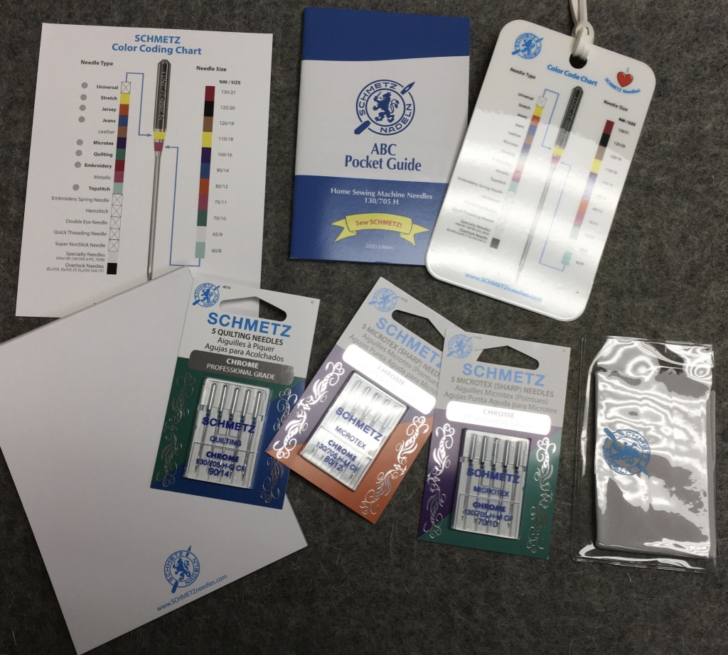 Awesome needles!!! What else can I say? Chrome needles in 3 different sizes: Microtex 70/10, Microtex 80/12 and Quilting 90/14. As well, they sent the colour coding charts, a luggage tag (for when we can travel again!), a cleaning cloth, a pocket guide and a notepad! (I think I’m spoiled!) Schmetz