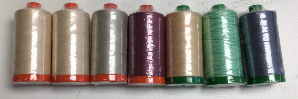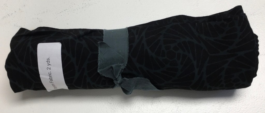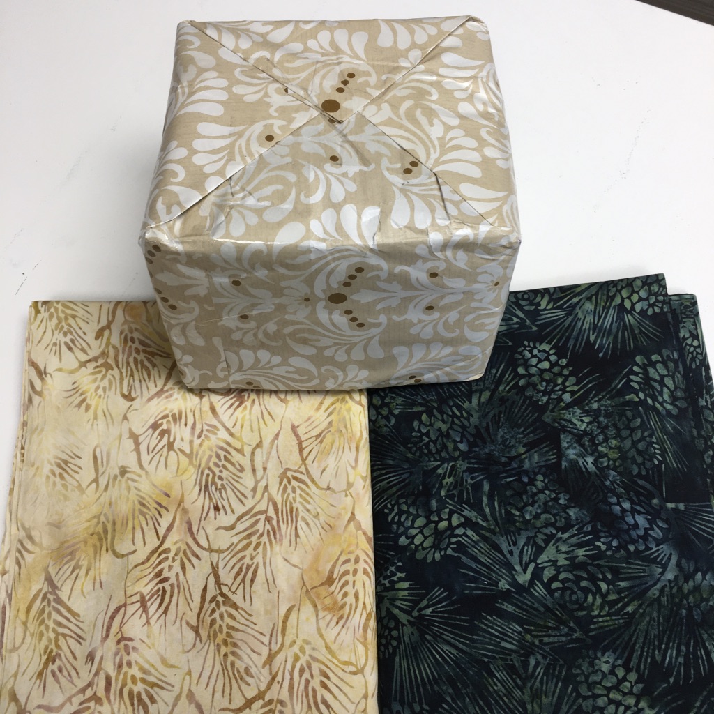 The wrapped package contains fabric for a blog hop in May. Look at the beautiful coordinating fabrics! There are 2 yards of “Wheat-Dusk” and 2 yards of “Pinecone-Dark Teal.” Mmmm … wonder what I’ll be making with these?