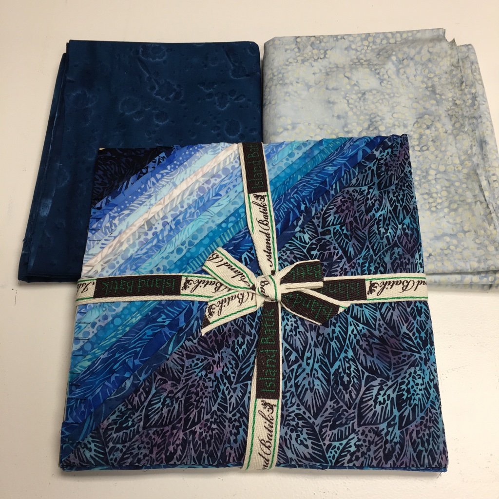 This is Harvest Blue! Designed by Kathy Engle. Lovely yellow and Blue 2.5″ strips (40 pieces, 20 fabric designs) along with 2 yards of “Ogee Petal-Sunshine” (from the Blender’s collection) and 2 yards of “Universe” from the Basic’s collection. (Blenders and Basics are available all the time.)