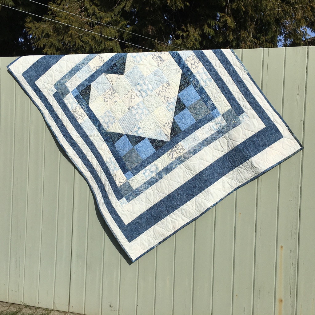 Well, as soon as I had the heart done with the blue around it, I decided to make it bigger … and borders were added … then more borders. All of a sudden (after a few hours), I had a quilt instead of placemat.