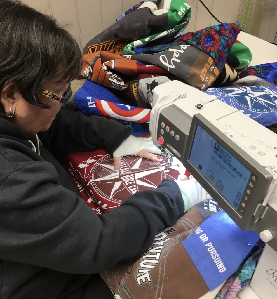 I finished the T-shirt quilt. Between the backing, the hanging sleeve and the binding, I used over 12 yards of fabric!