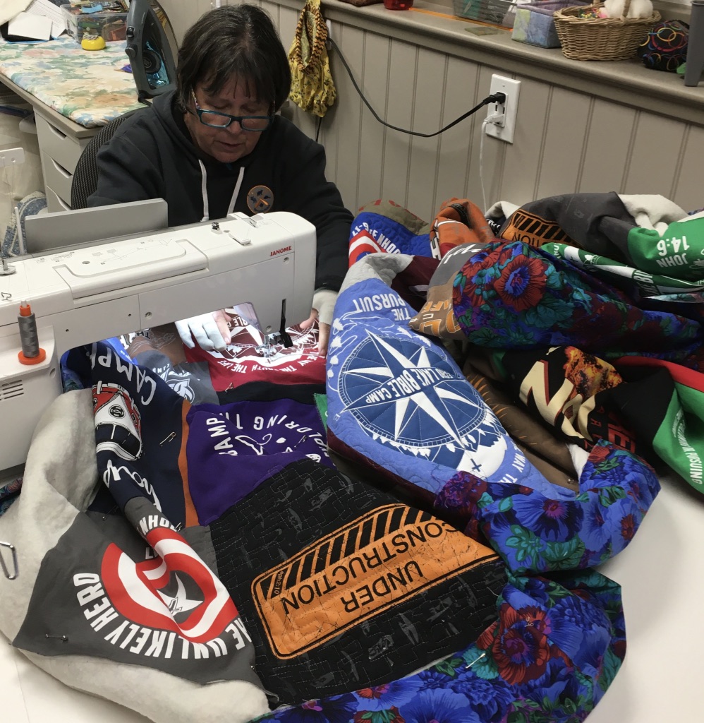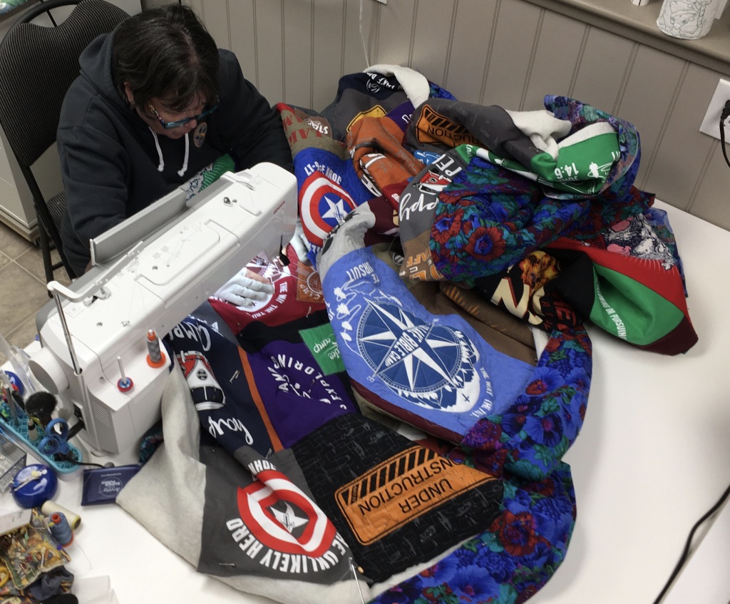 I was Zoom quilting with my sister and 2 cousins … it sure helped keep my on track. I’m working on the T-shirt quilt. It’s not an easy quilt to work on. I’m trying to fit things together … however, I have not sworn (OUT LOUD) and so, it can’t be all that bad. However, I did watch a youtube video of Angela Walters making a T-shirt quilt and thought that would have been a way easier way to make one … but alas … I did want to use ALL of the T-shirts I was given … and they all seem to fit in – sort-of! Even though they are backed with interfacing, there is still a lot more stretch than with quilting cotton!