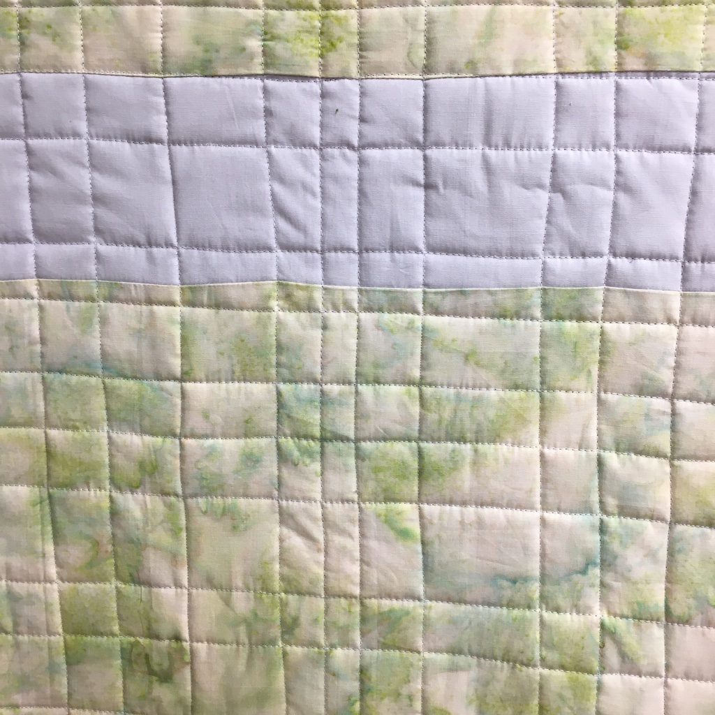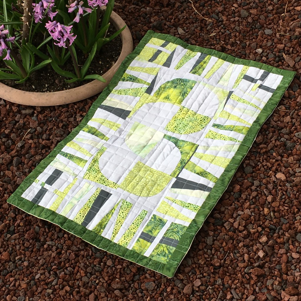 This used Island Batik fabrics: light and dark grey solids, and the greens were: Marble Frog – BE, Celery, Bubbles: sprout, and 2 other greens that were in my IB scrap bag. The backing is a combination of Celery and Light grey solid. You can see the back HERE. Hobbs 80/20 Cotton batting was used and it was quilted with Aurifil #2600 (Dove).