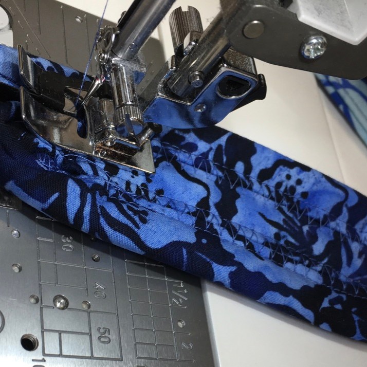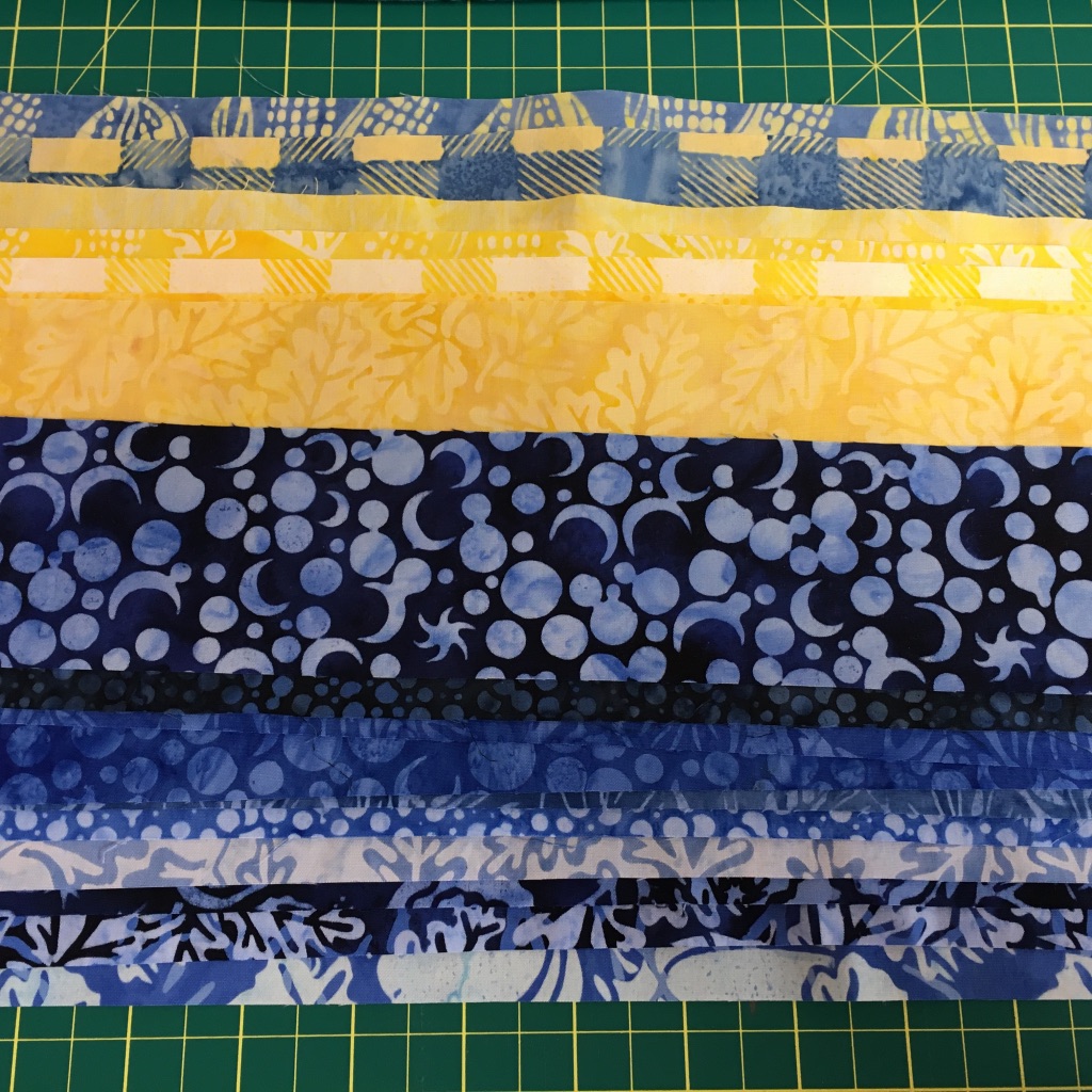 Next, the strip was sewn, using a 1/4″ foot. I wanted a heavier needle for this step, since it would be going through 2 layers of fusible batting and 4 layers of batik. Schmetz Quilting Needle 90/14 to the rescue! On the Yellow one, I used Aurifil #2000 (Light Stand) and on the Blue I used # 1128(Light Blue Violet).