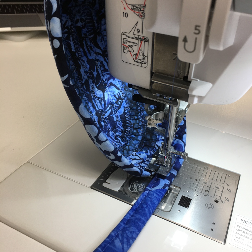 The “putting it together” was started. I used a 7mm wide zigzag and a stitch in the ditch foot. The foot flange was kept between the “new” and the old piece. I attempted to keep it flat. This involves some squishing on the corners and ignoring the wrinkles that appear. The first time the bottom was too rounded and I had to take the whole thing apart. On the 2nd attempt, I managed to keep it flat for about 1.5″ … then I allowed the bowl to curve up. All the time, I worried if I’d be able to keep it going out … I didn’t want the bowl caving in on me! But, it seemed to just go nicely.