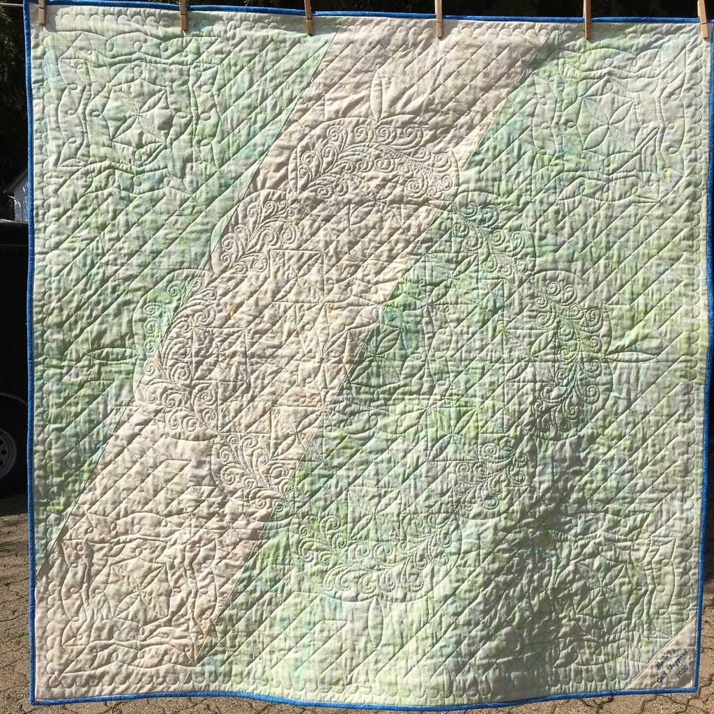 Hobbs fusible batting was used. I absolutely LOVE this batting!!! There is absolutely NO shifting and it is so easy to iron on! (I do the ironing on the spare bed.) Aurifil #4669 (Stonewash Blues) is the top quilting thread, #5008 (Light Grey Turquoise) was in the bobbin and shows up on the back, and # 1128(Light Blue Violet) was used for the binding. Schmetz Quilting Needle 80/12 was used.