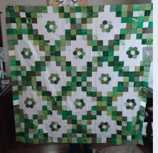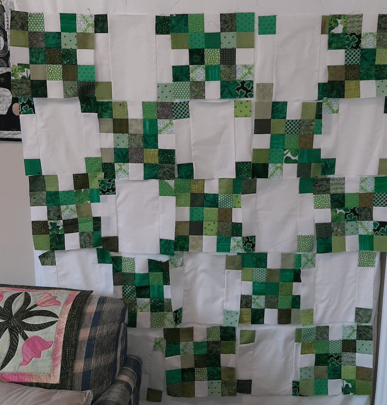 Here is Carol’s and this is what she says: “They are not sewn together yet,as I want to do something in the white blocks. Maybe a hexagon, or Shamrock. ”
