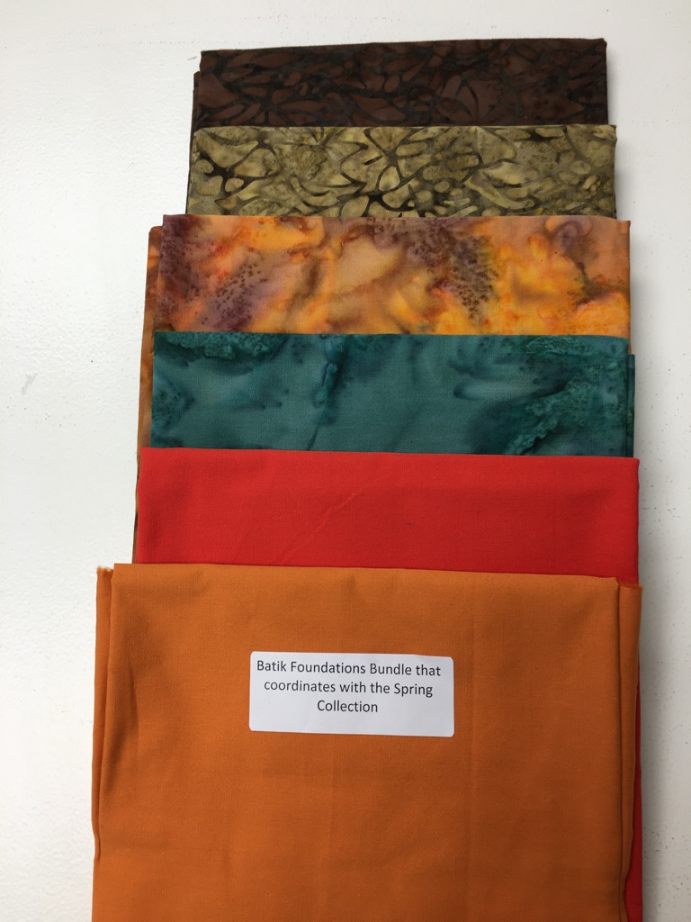 I also received 2 Fat Quarter Bundles of Autumn Wings, an Island Batik collection designed by Kathy Engle. Along with 2 yards of coordinating Bubbles-Sahara (from the Blenders collection and 2 yards of Teal from the Basics collection. Autumn Wings should be available in the shops now and Bubbles-Sahara and Teal are available all the time. (Photo on the right). The Foundations collection (on the Left) coordinates with Autumn Wings and are available all the time!