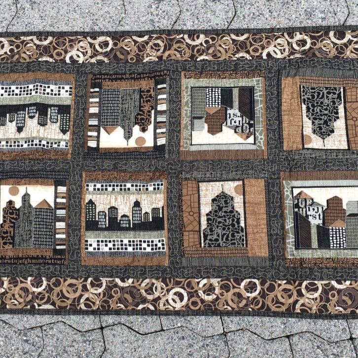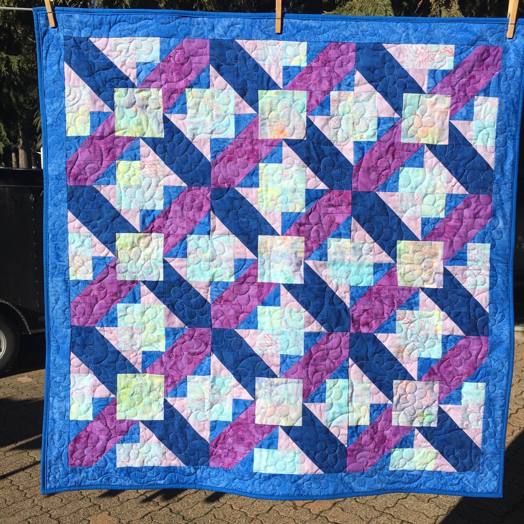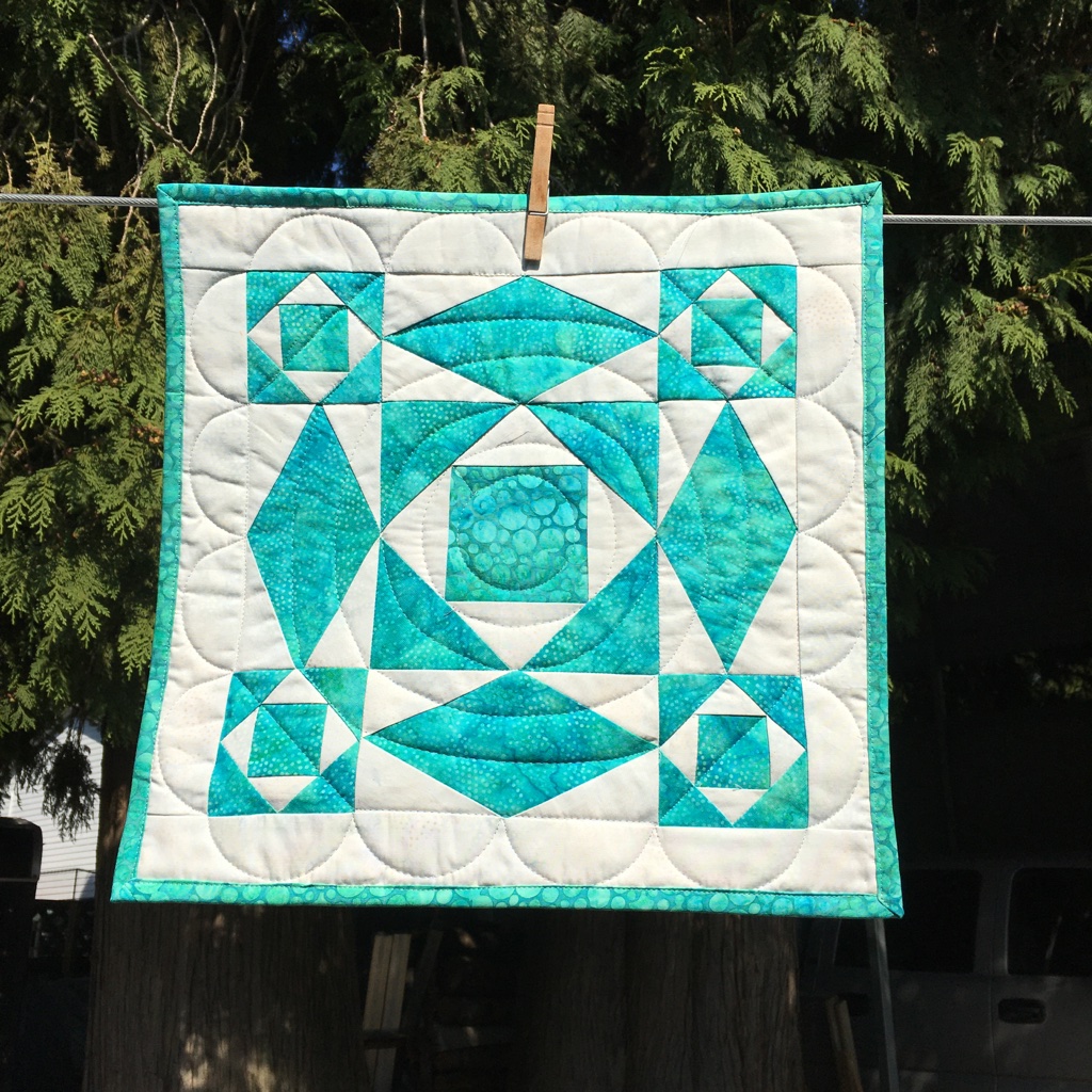 The monthly table topper is run by So Srappy. The colour for August was aqua. I wanted to try a paper pieced Storm at Sea block … so that’s what I made! It’s 15″ square. Made with Island Batik fabrics, Hobbs fusible batting and Aurifil Dove thread.