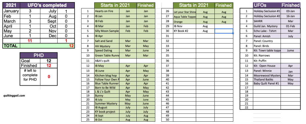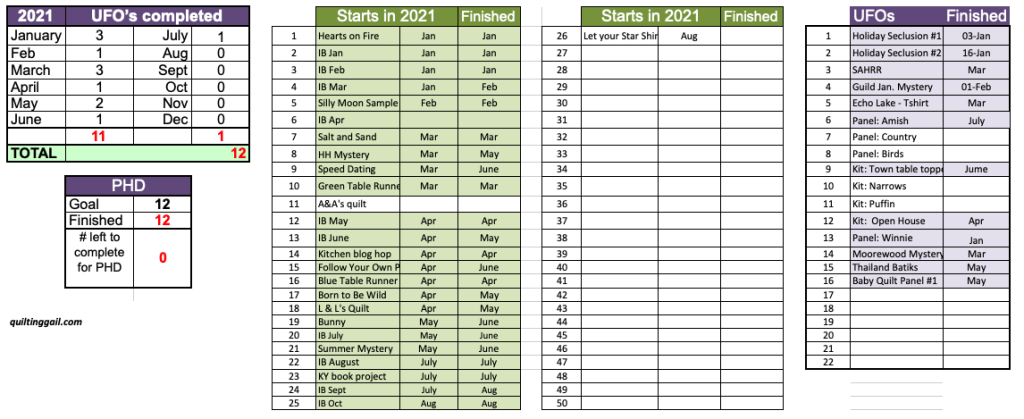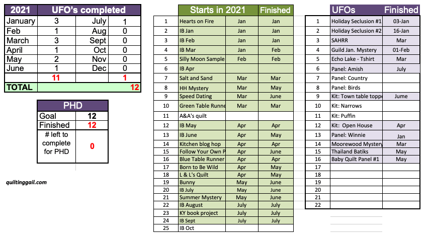 My PHD tally hasn’t changed a lot. Well, no UFOs are finished, but quite a few of the Starts in 2021 are completed. I’ve been working a LOT of my November Island Batik challenge. I am SEW glad that I started early! It’s taking a LOT of time and a LOT of concentration. You’ll see why in November.