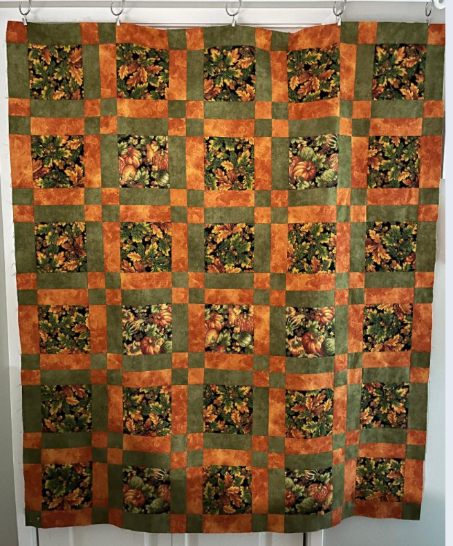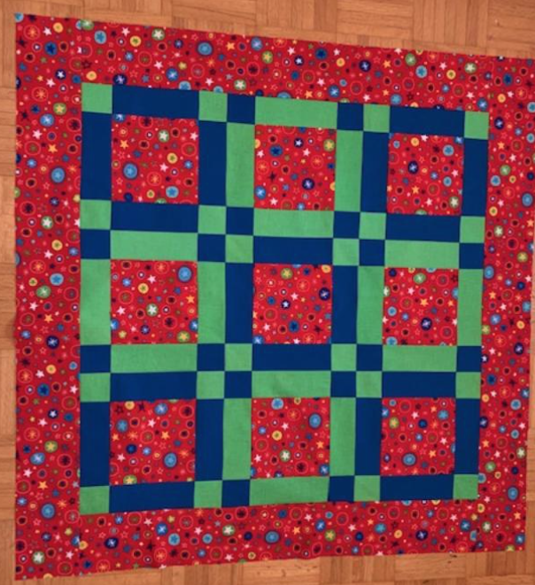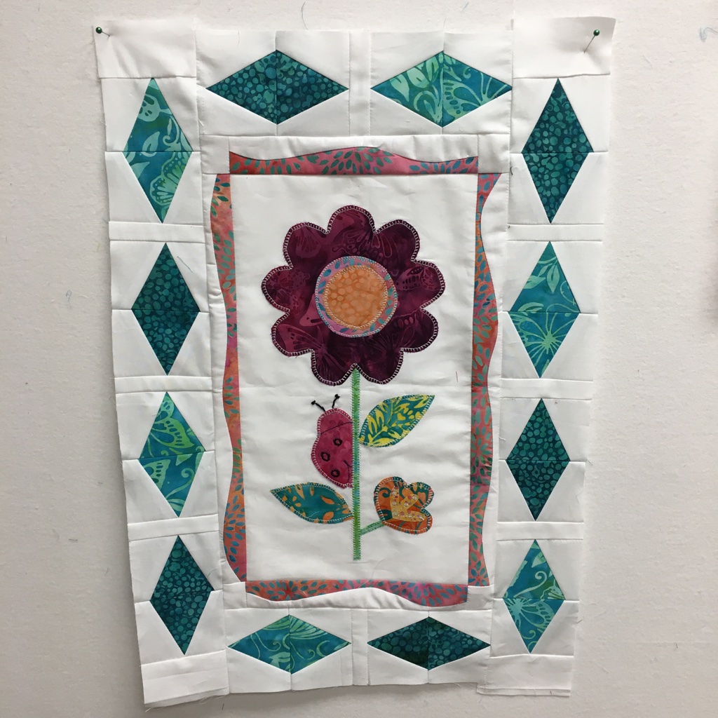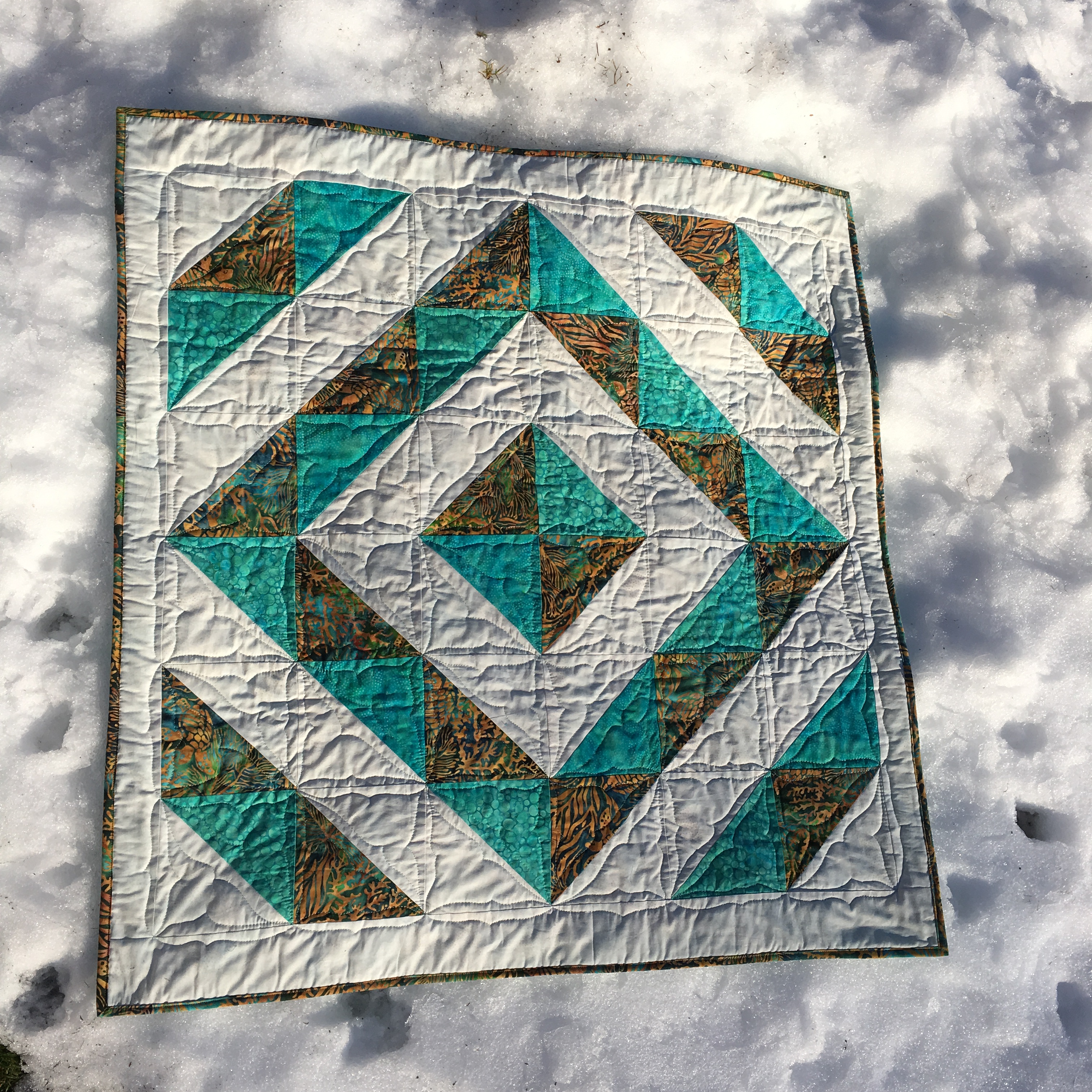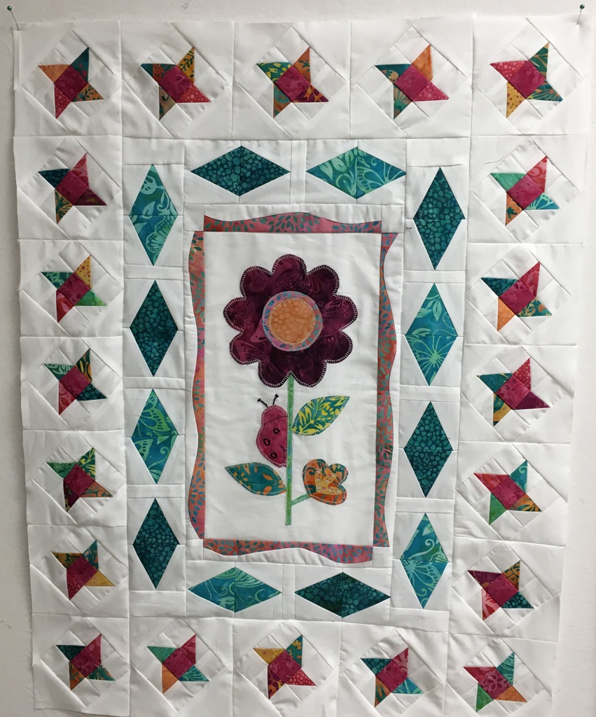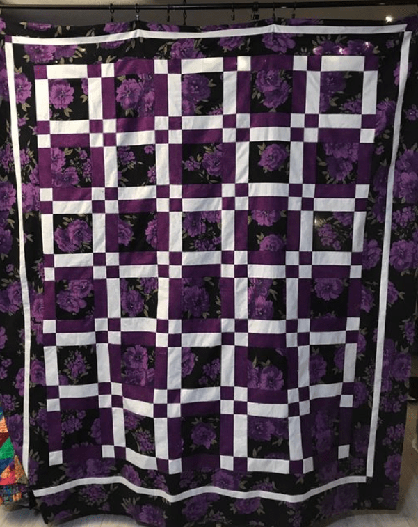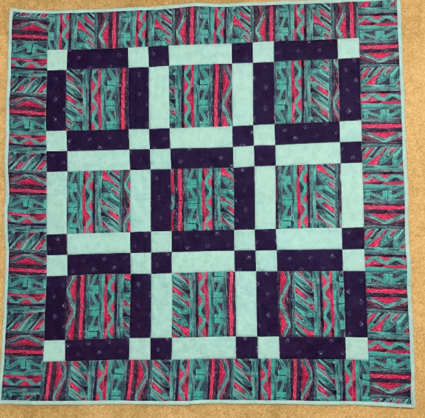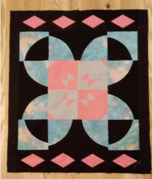 This is what Stella says, “While rummaging in the pile on my table I found a small diamond ruler( came free with a jelly roll!) so I thought it must be a hint to do my homework! I’m sure there must be an easier way to make diamonds but I just kept plugging along…..and this is what happened….” “I’m calling it “a modern amish”. Loving the black and brights.”