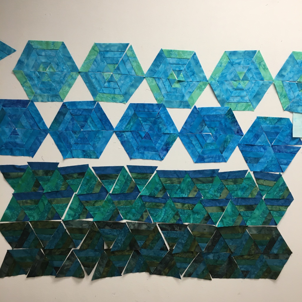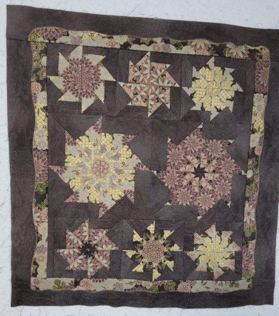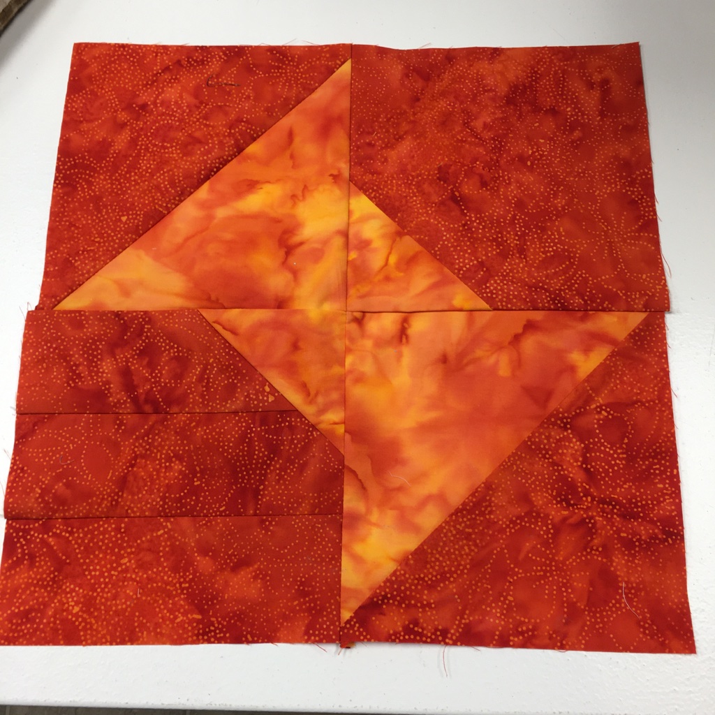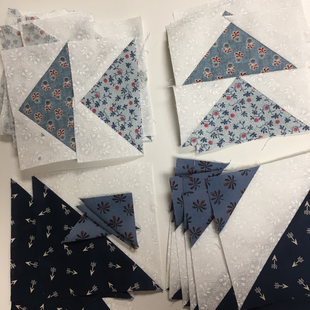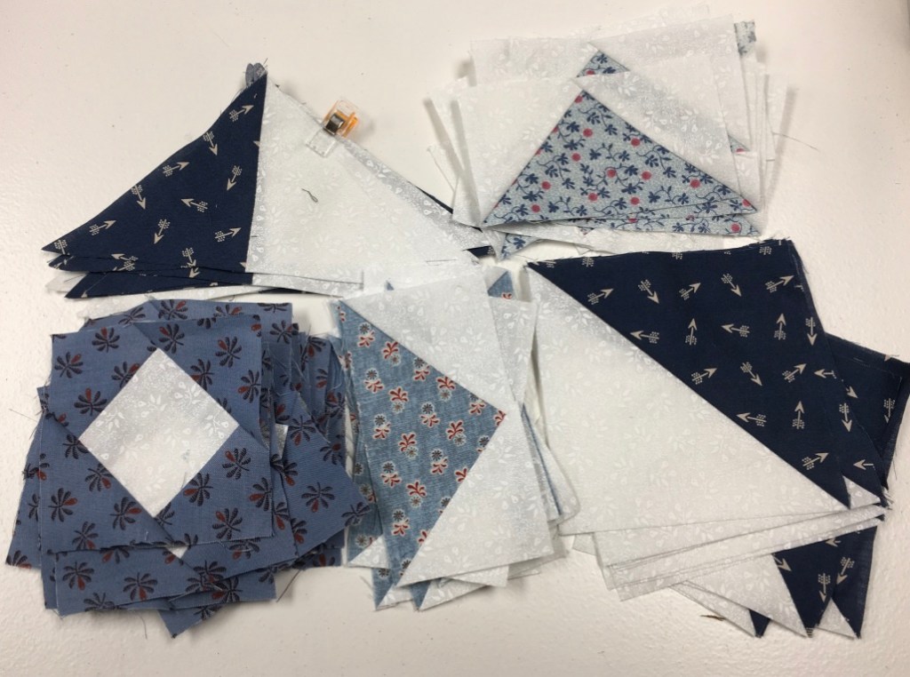 My stars are little! The HST are 1″ square. When I had them done and put up on the design wall, it seemed too crowded. So, I added more white fabric and made them a square in a square.