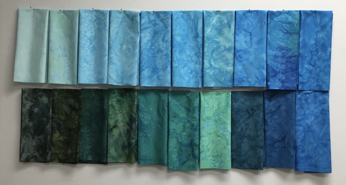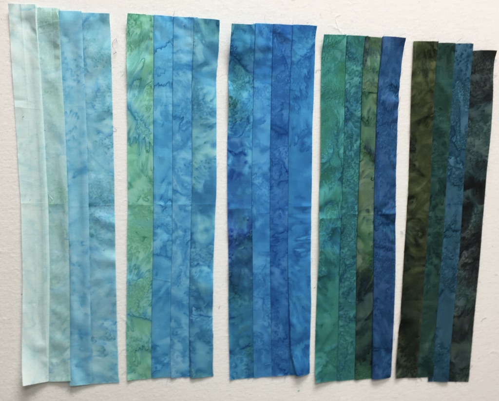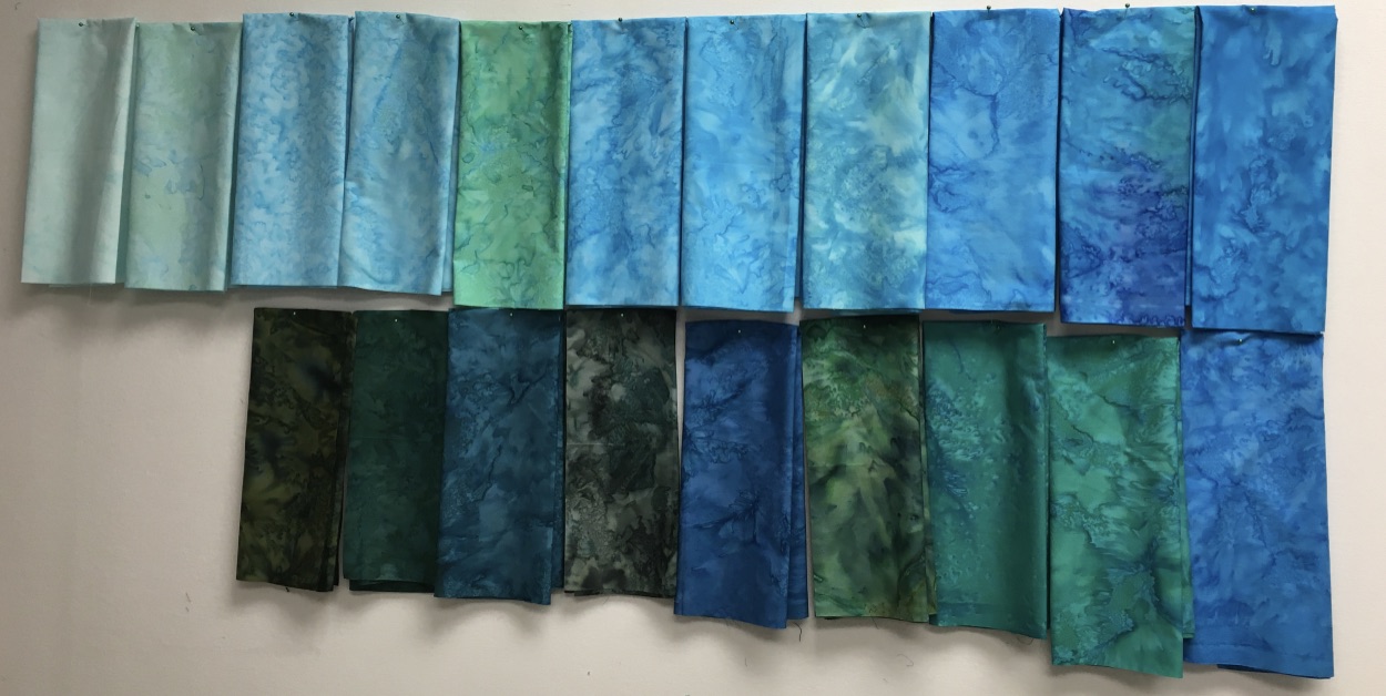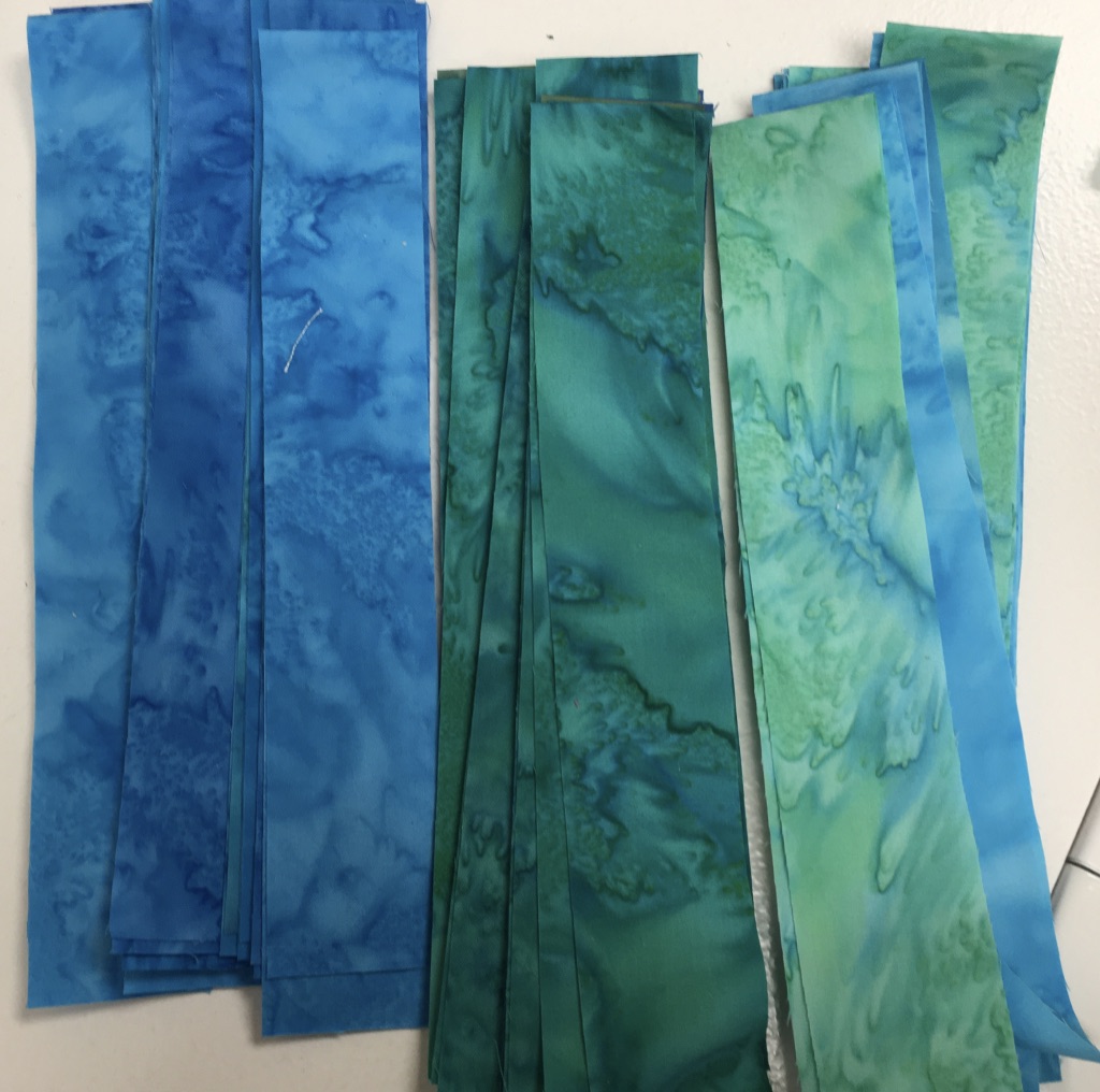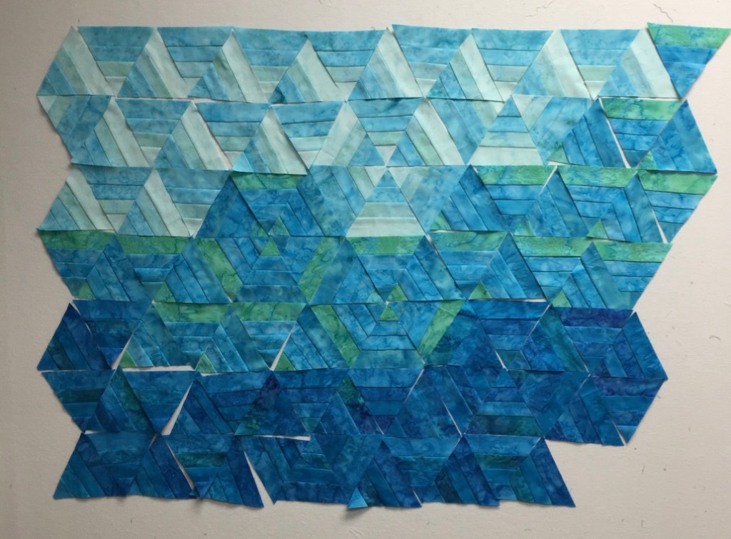 My stars are little! The HST are 1″ square. When I had them done and put up on the design wall, it seemed too crowded. So, I added more white fabric and made them a square in a square.