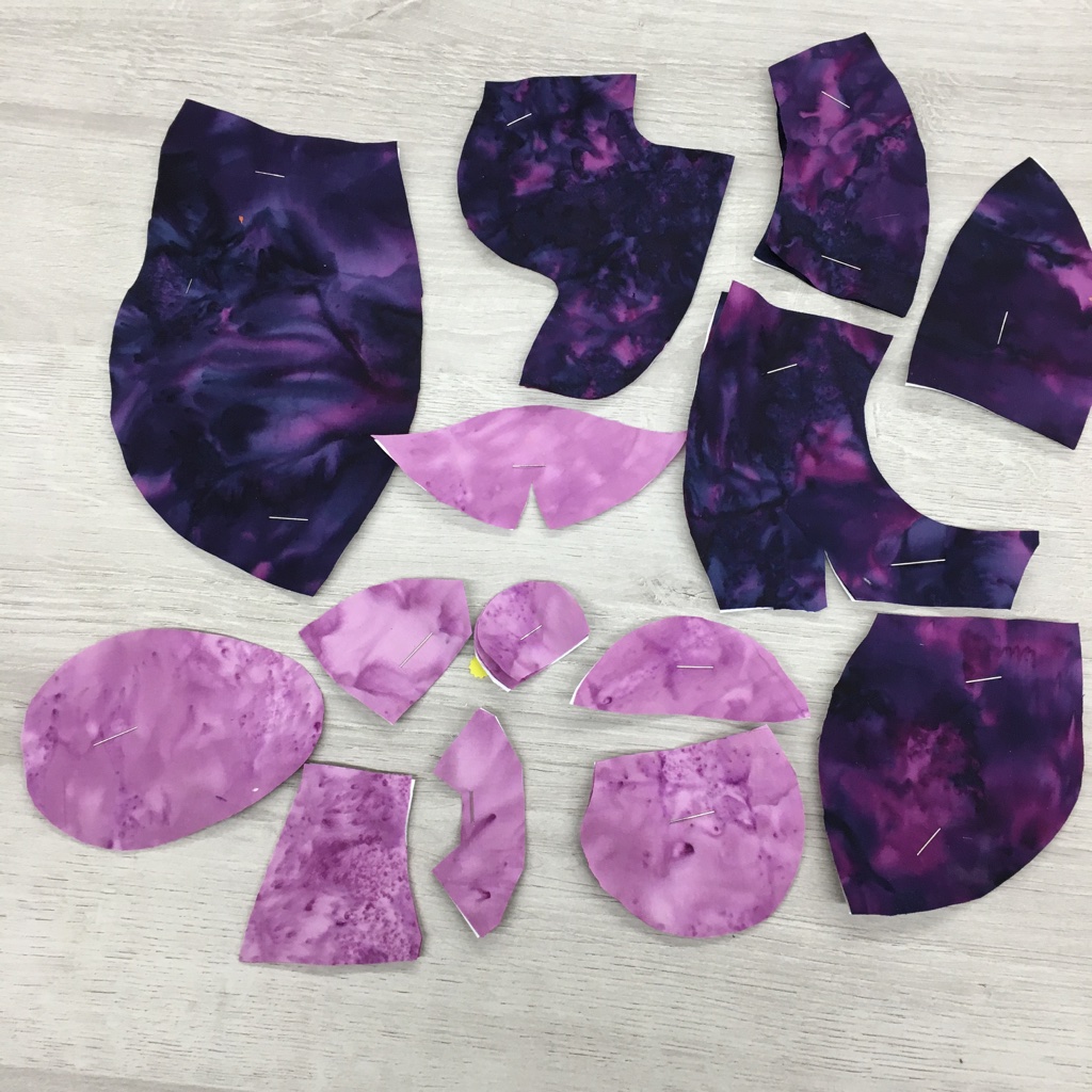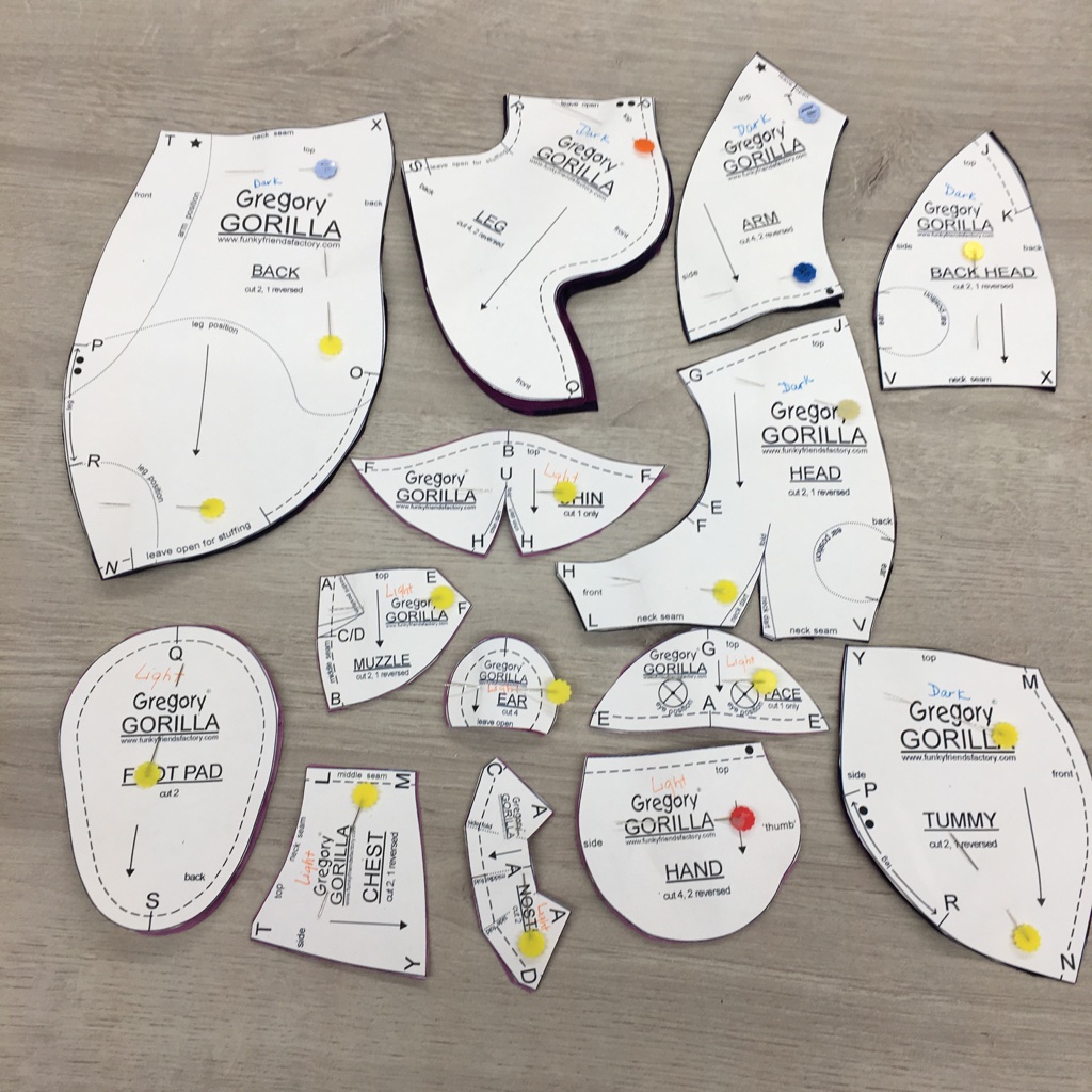There are lots of parts for Gregory … and here they are, all cut out. The pattern pieces are still pinned to the fabric because many of them contain necessary markings for when you’re making the critter.