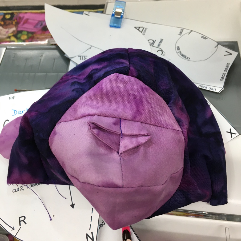 And the head is starting to take shape! Can you see his nostrils? They make me laugh! I used Aurifil Thread 2581 (Dark Dusty Grape) to sew with a Schmetz Needle.