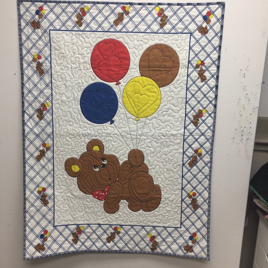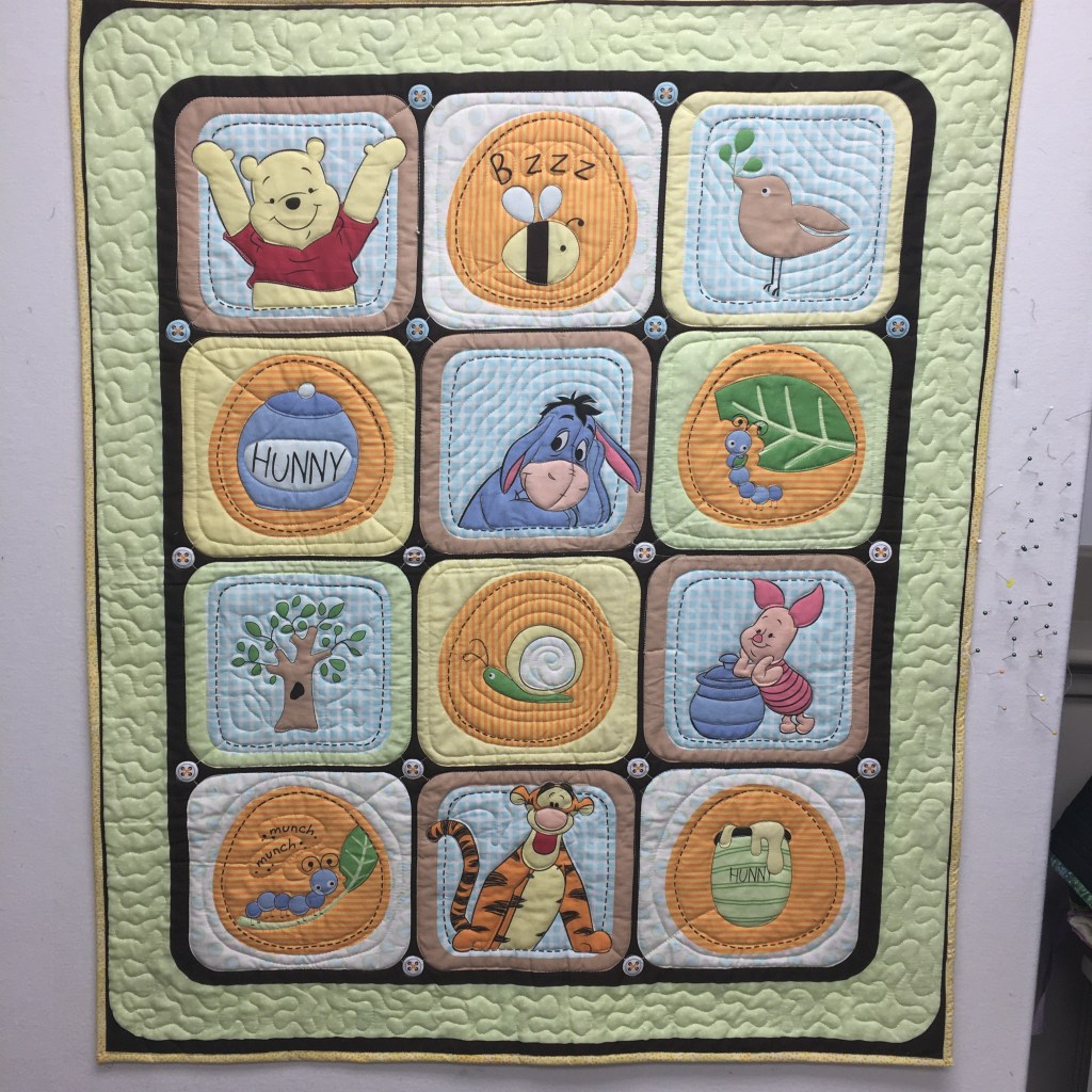 Here’s a picture of the latest baby quilt panel. It was a fun quilt to quilt! Of course, I adore Winnie the Pooh – so that just made it even more fun! And yes, this is a finished UFO!