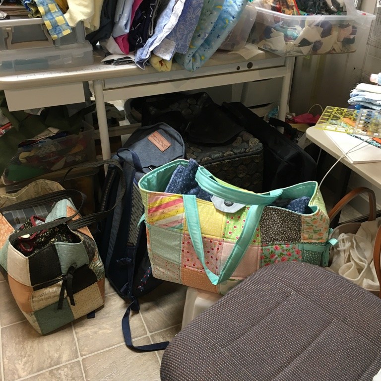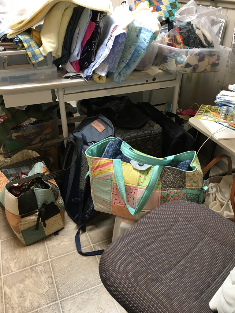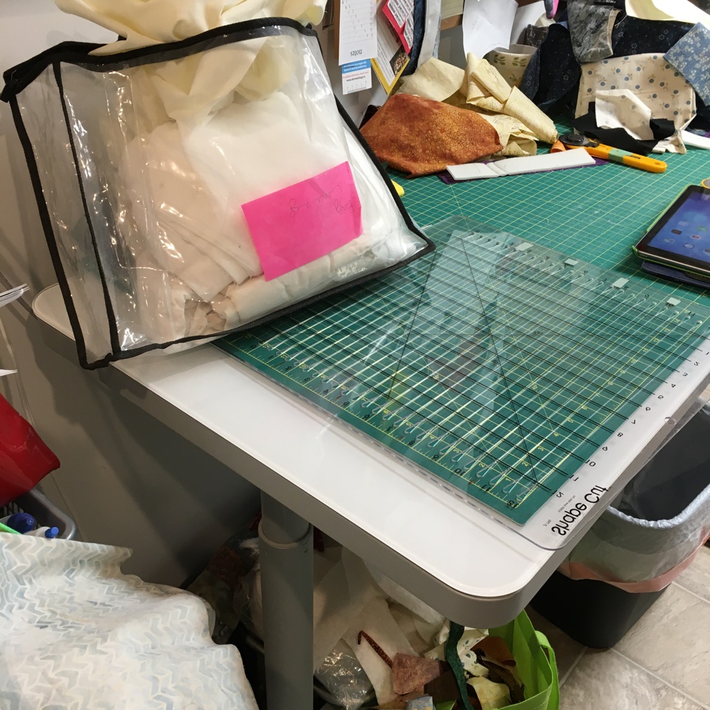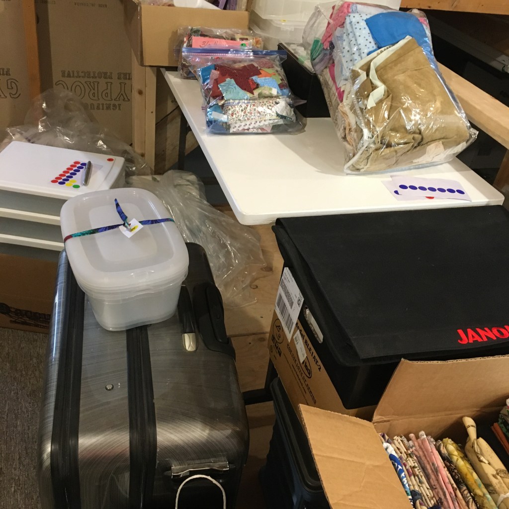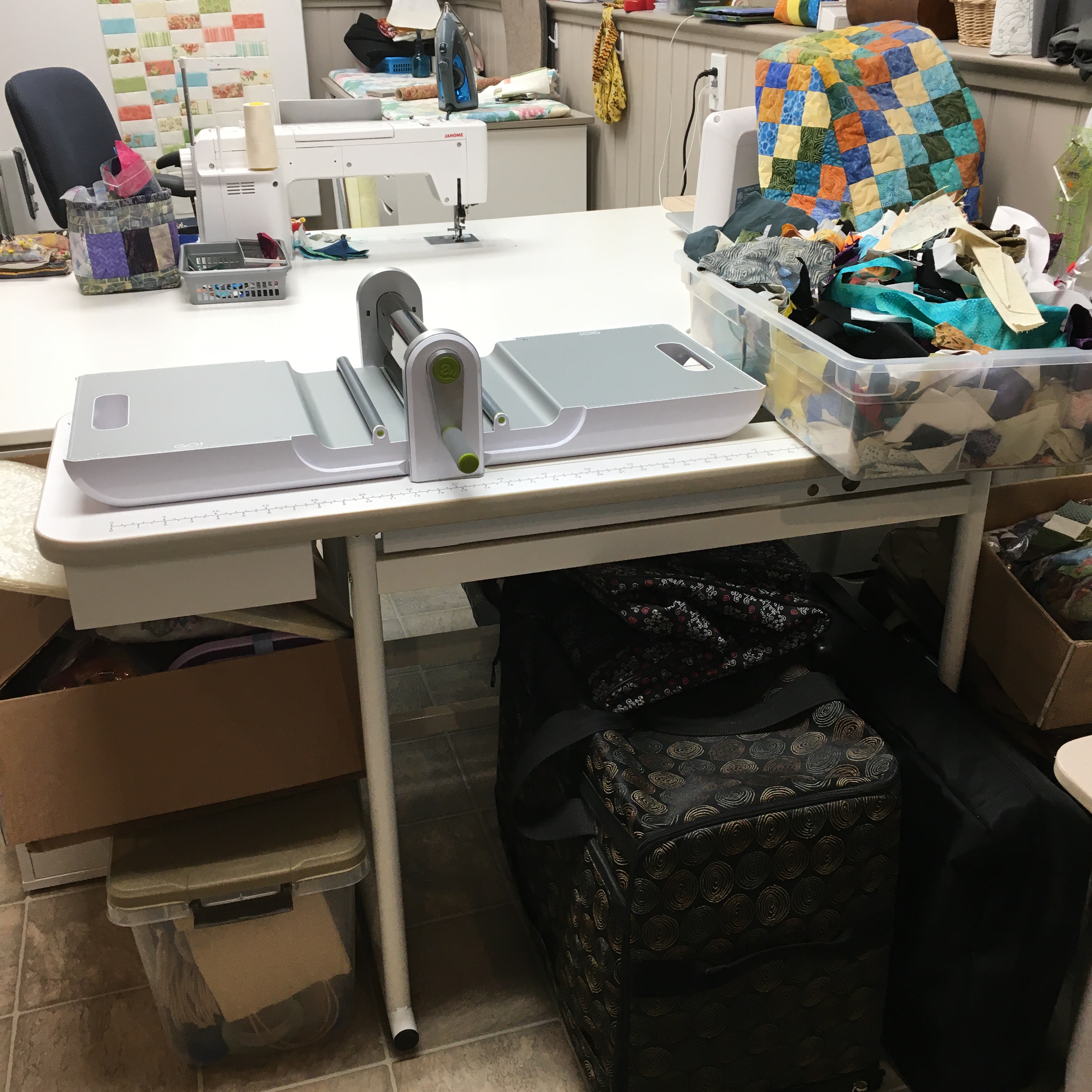 Another area … The bags on the floor were emptied and things put away. The sandwiched quilts and various other things are in appropriate spots. Finally, there is a permanent home for my Accuquilt … with the Island Batik scraps ready for cutting … much better than putting it away all the time!