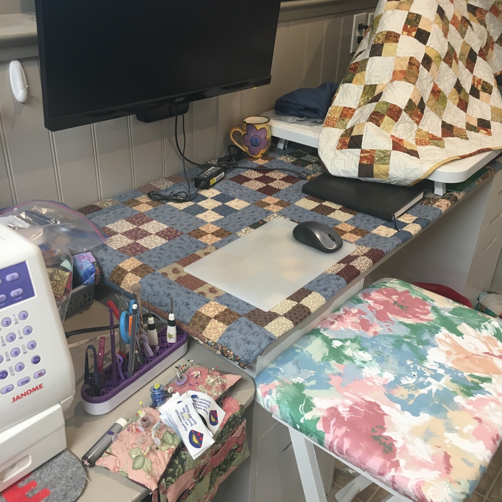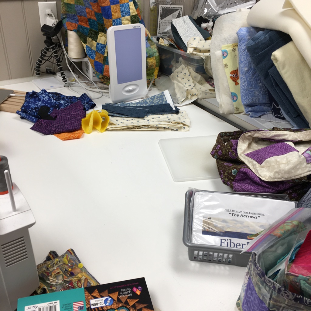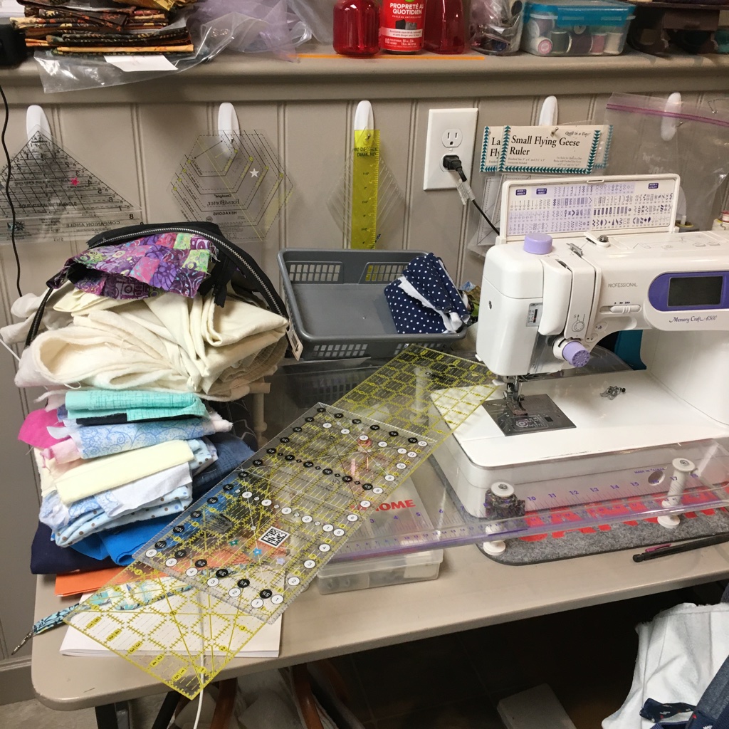 My quilting area … the SAD light stays and the laptop gets moved so I can view whatever as I’m quilting or zoom quilting or ??? Another leader and ender project ready when I piece on this machine and the area is clear for quilting. So, hopefully, I won’t quilt spare pieces of fabric into the back of whatever I quilt!