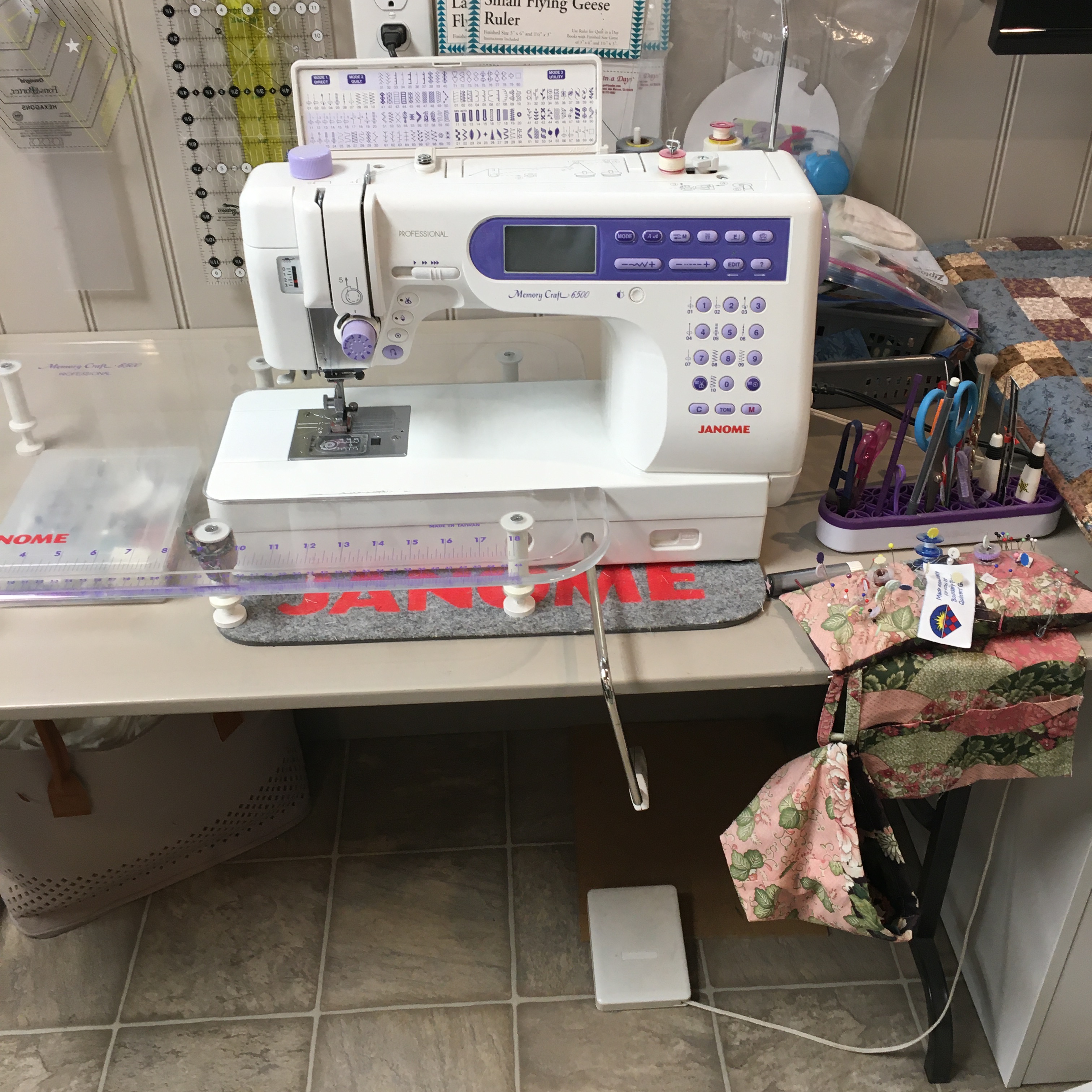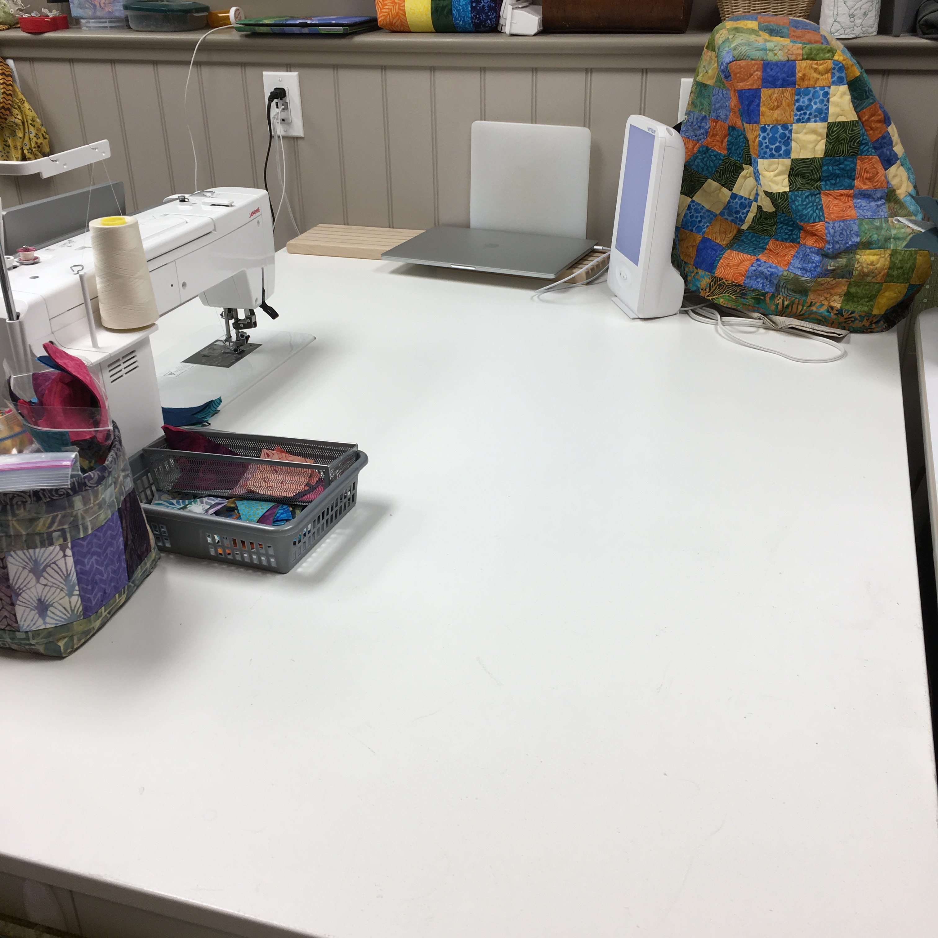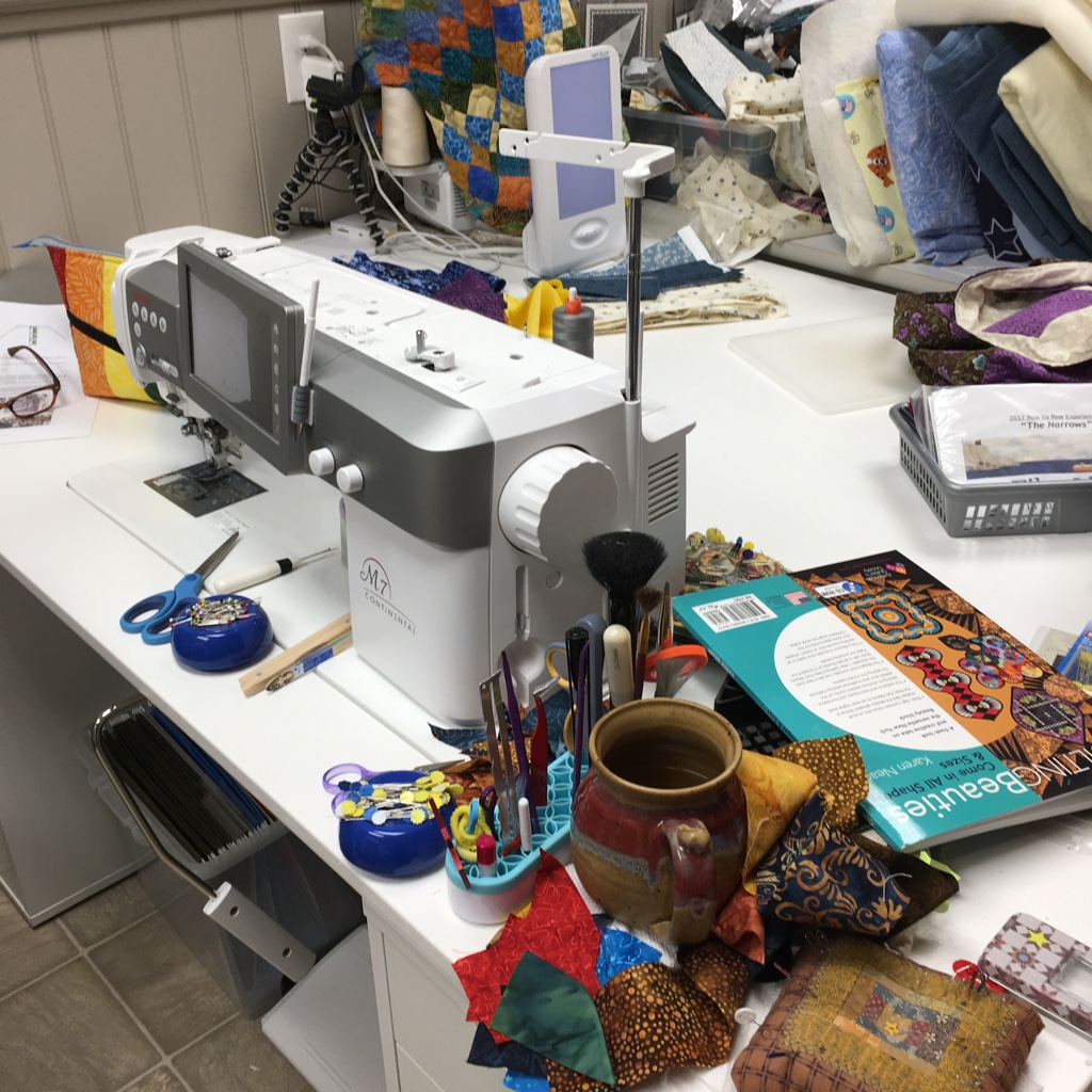 My quilting area … the SAD light stays and the laptop gets moved so I can view whatever as I’m quilting or zoom quilting or ??? Another leader and ender project ready when I piece on this machine and the area is clear for quilting. So, hopefully, I won’t quilt spare pieces of fabric into the back of whatever I quilt!