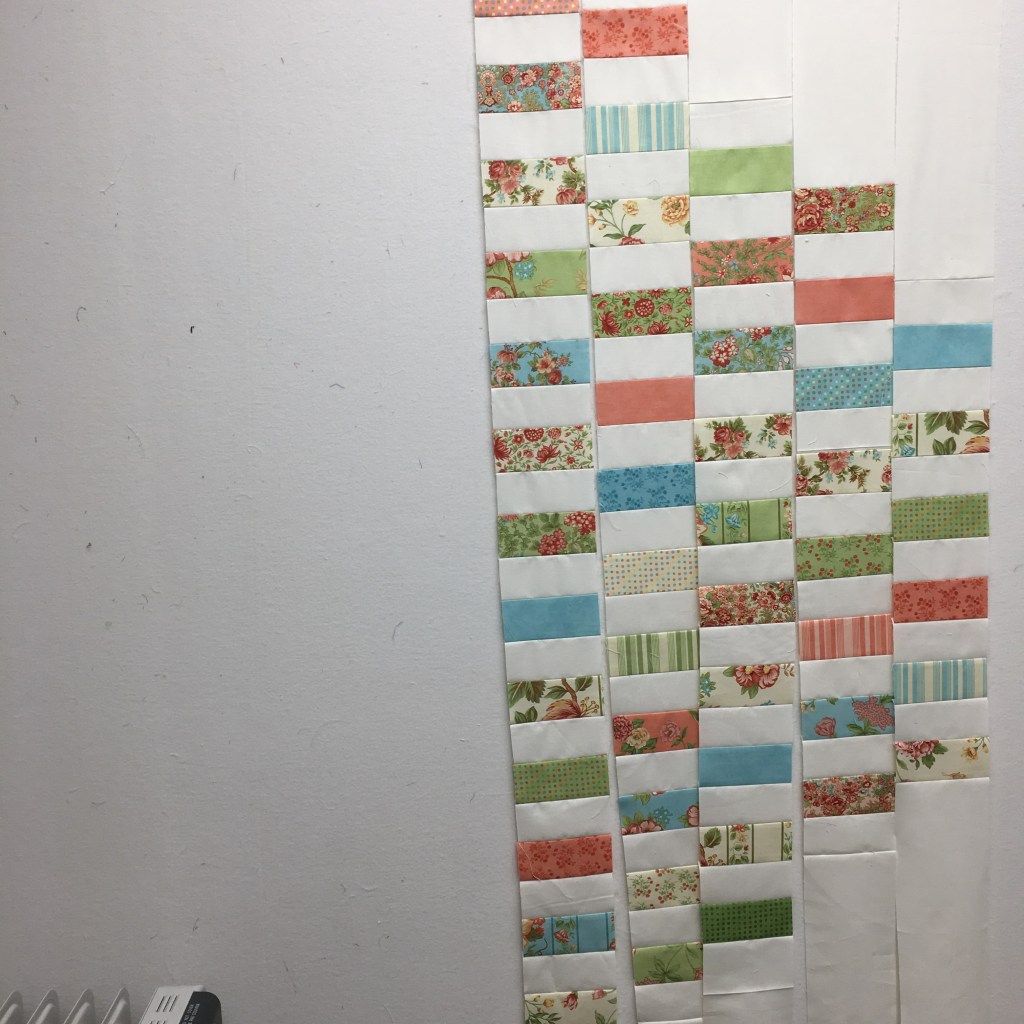 2. A Squirrel Attack: As I was going through my containers … I found left-over strips from a jelly roll quilt … well, they spoke very loudly to me and said, “USE ME NOW.” Well, I have learned that it’s usually worth listening to fabric when it speaks to you. This is one half of them and there will be sashing added between the rows.