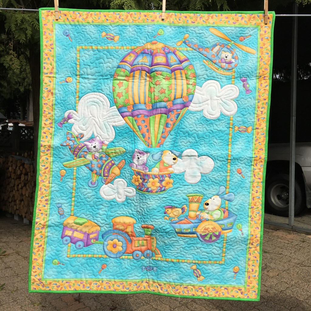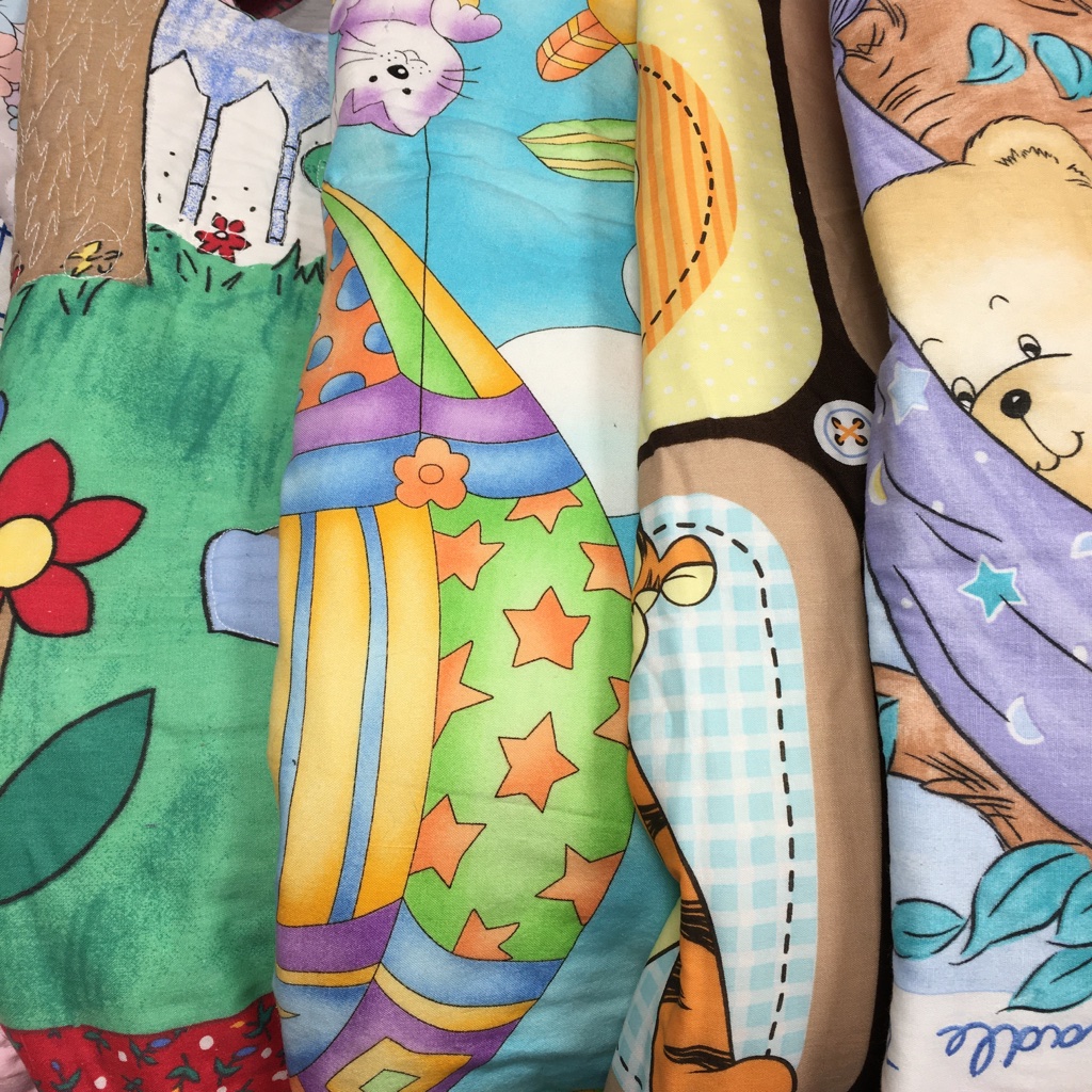 I have 5 Baby Quilt panels lined up to be quilted and 2 that need binding. Boy, will I ever be glad when I no longer have cute panels in my stash! Some of these were panels that were given to me … I sandwiched them ages ago, but the quilting didn’t happen! And, I did find some of them when I went through a container – part of the Overhaul! 2 of the Baby Quilt panels are partially hand quilted … they will have machine quilting for the finish!