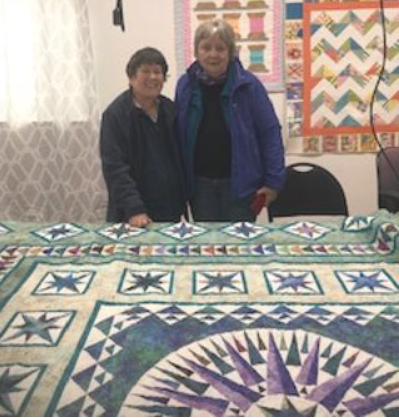 We met and talked about quilts and quilting. She is one talented quilter! Here’s a picture of us – but look at her quilt! Isn’t it absolutely fabulous? If I remember correctly, she said it’s 110″ x 110″. HUGE!It’s a mariner’s compass with lots of other blocks. She designed the quilt. I was in awe!