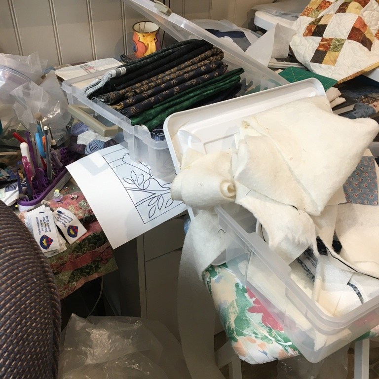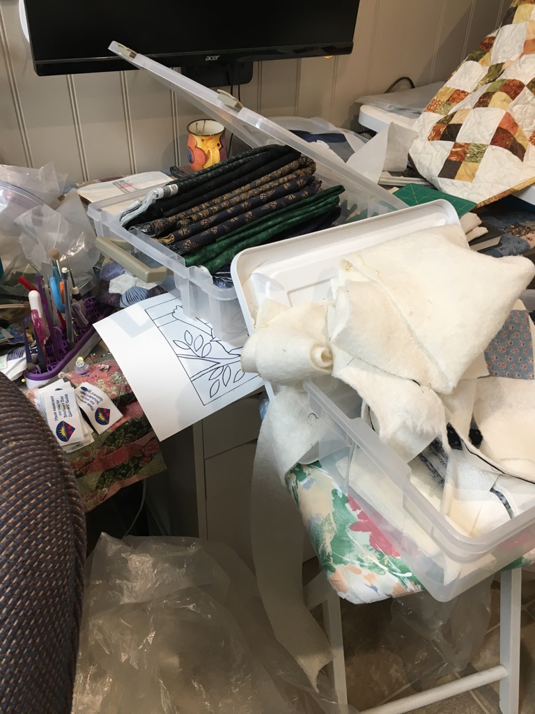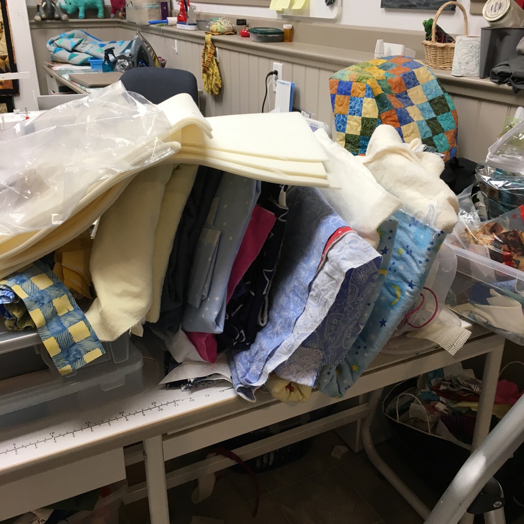 Here’s some pictures … as the room was before I started going through things: What a mess, eh? Every available surface cluttered with projects and fabric I need to put away, some baby quilts to be quilted, things to be unpacked from my latest class, fabric to be sorted through, papers cluttering up my computer desk, and left-over batting and fabric on my cutting table!