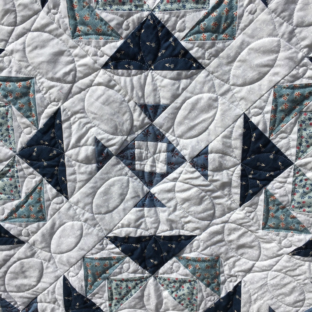 The fabric all came from my stash. As did the backing fabric. It has Hobbs 80/20 batting and I used Glide thread (Mercury) to quilt it. The binding is the medium blue print.