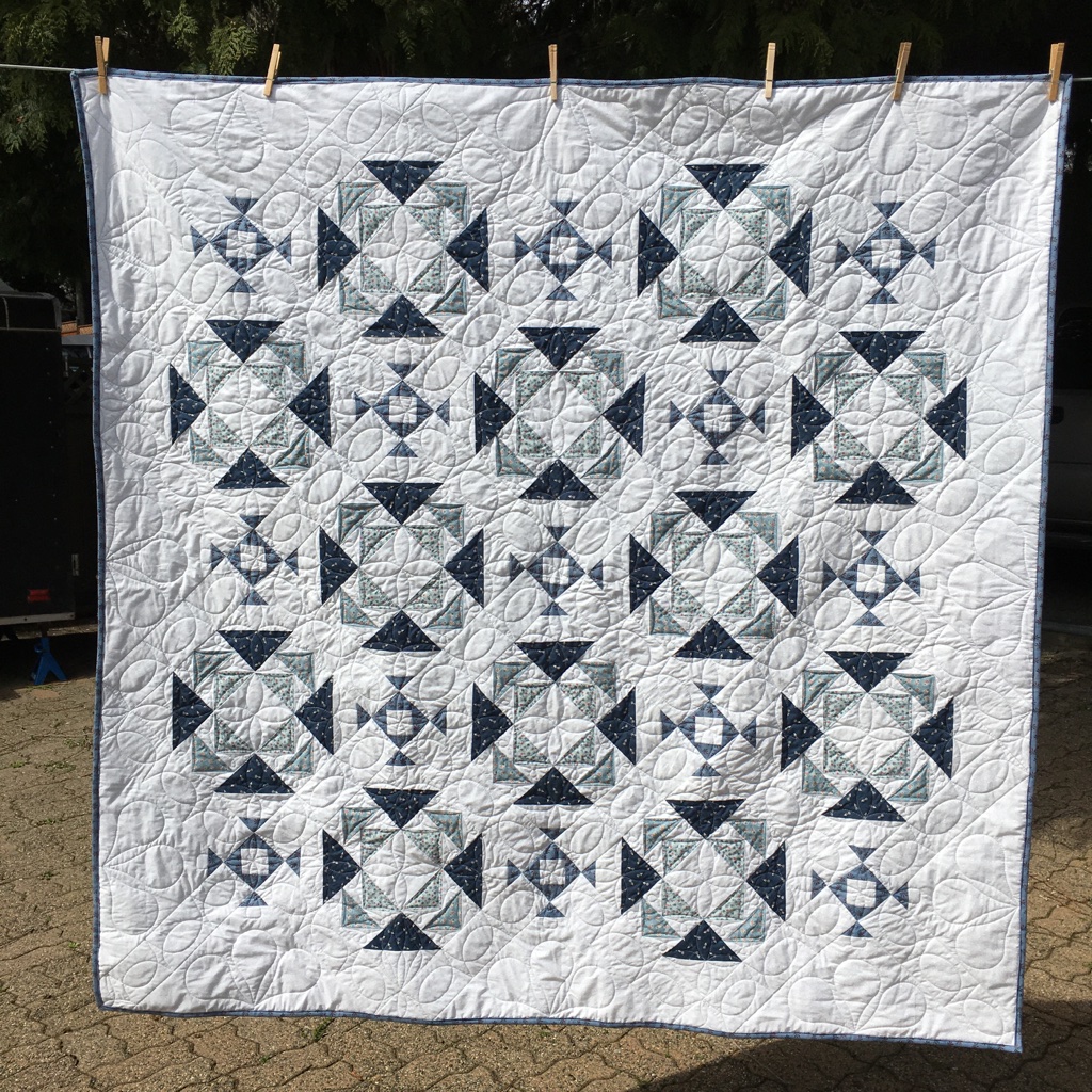 Here is the finished quilt! I must admit that it went together much easier once I made the triangles all the same size. And there were no Double E bra sized lumps … there was one “A” sized one, but that was easily quilted out!