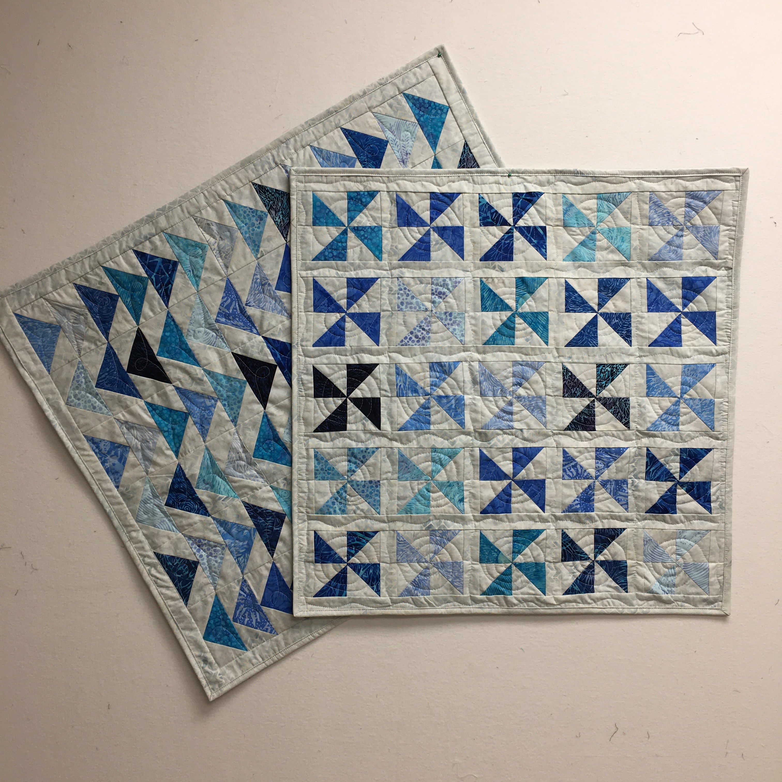 I used my 8″ Cube Accuquilt #4 & #5 dies to cut out triangles with the left-over Starry Night fabrics. Then I cut tons of triangles with #5 die using Chevron – Iceberg … my plan was to make something cool with HST and flying geese. I made lots of HST and flying geese, but my plan did not come to be. That was OK … I decided I’d make one topper with HST turned into pinwheels and another with the flying geese.