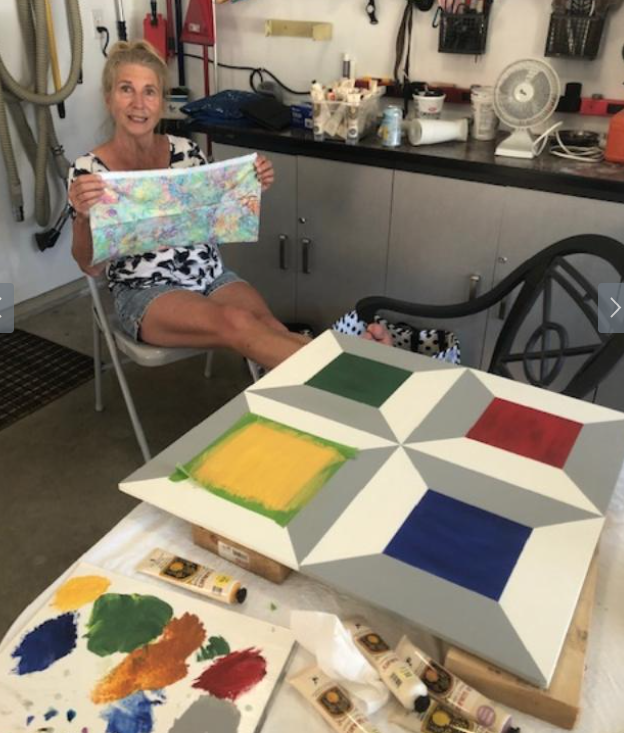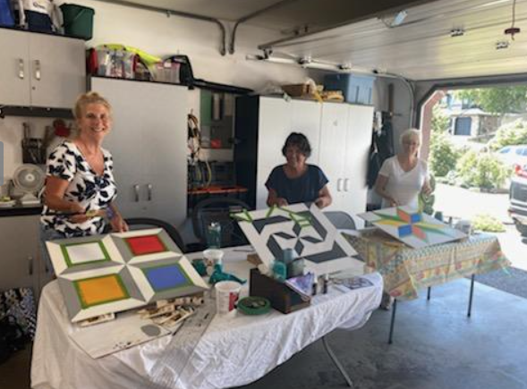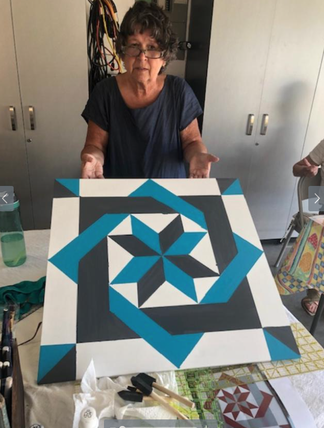 A bunch of us got together to paint some barn quilts. Our host’s husband (George) very kindly prepped all of the 2′ x 2′ squares for us. He even primed them and sanded them!!