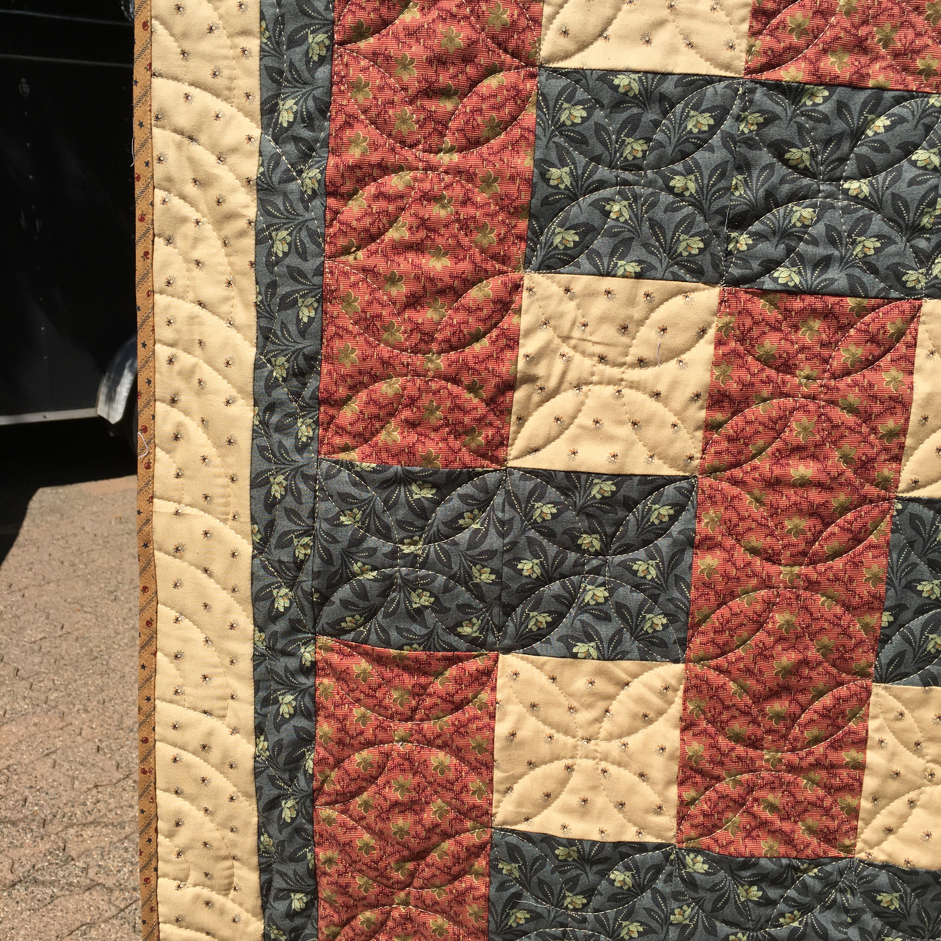 This quilt is from a pattern called “Dream Weaver” from the book “Quick as a Wink 3-Yard Quilts.” It was a quick and fun quilt to piece … however, when I went to put on the binding, I realized that the instructions called for 1.25″ binding. I obviously wasn’t thinking straight when I cut the red fabric for the binding. I ended up with strips of 1.25″ and I wasn’t about to make binding with it. And this quilt was definitely NOT calling for a flange binding! I didn’t have enough of the red fabric left, so I went to my stash and found the darker beige fabric. The moral of this story is to THINK about what you’re cutting and don’t just follow the directions!