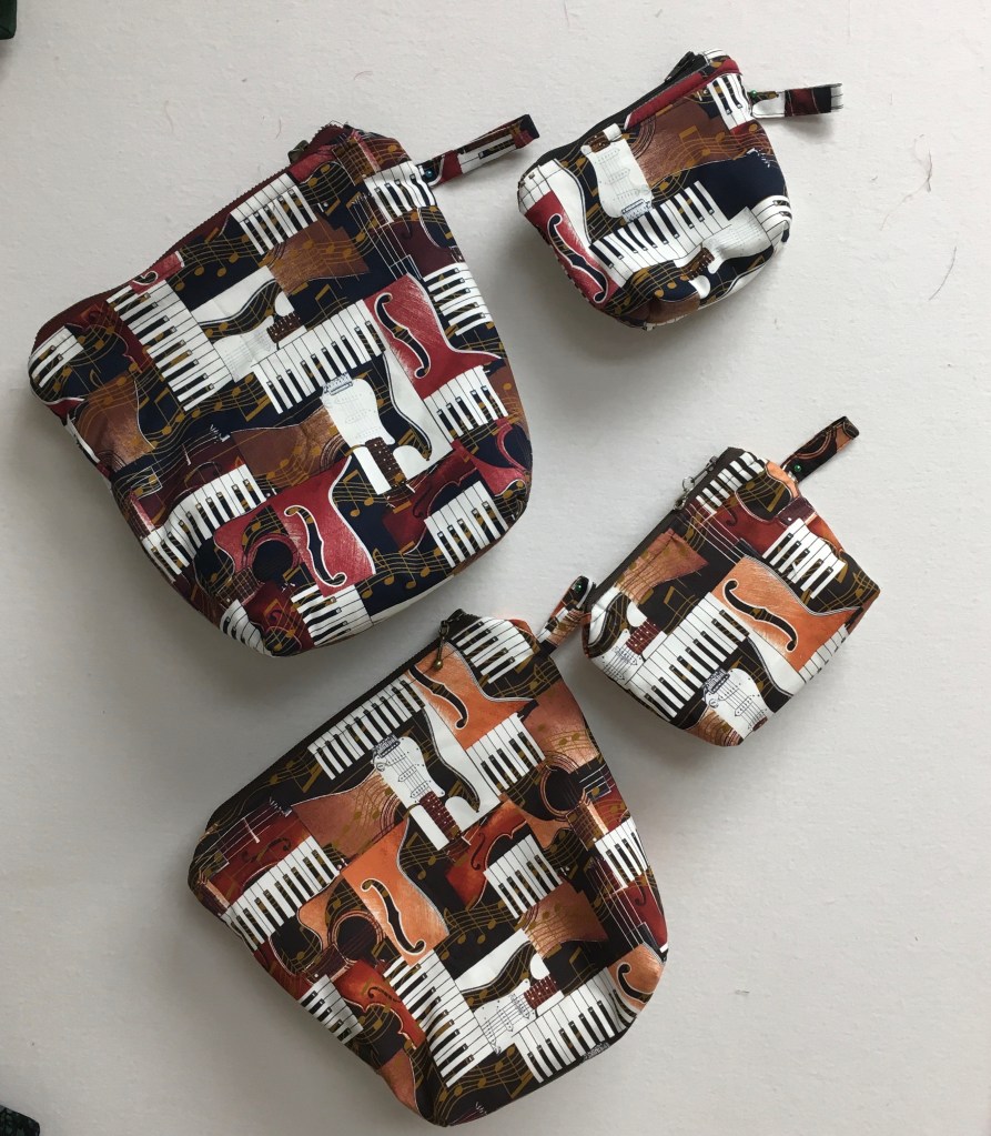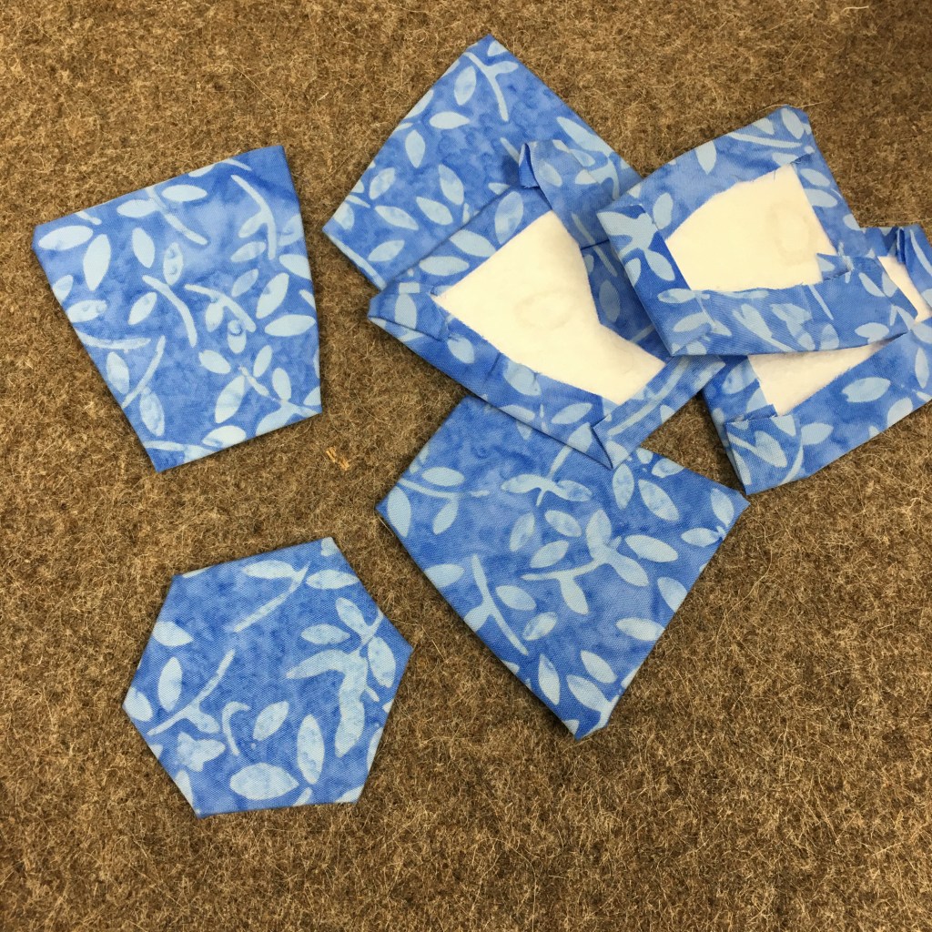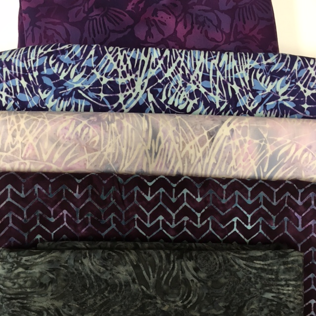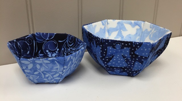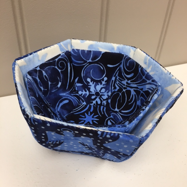 DrEAMI stands for Drop Everything And Make It. Well, this has been a S L O W DrEAMI … I can only hand sew for short periods of time, but I have made these 2 baskets! They are made with the Winter Sky Island Batik fabric. Aren’t they cute? The pattern is “Goodness Bowl” by Jean Paccagnan. These are the small and medium baskets.