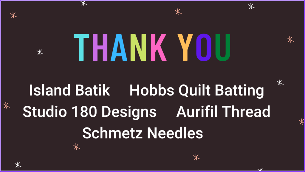 Disclosure: The fabrics, batting, thread and needles were generously supplied by the following companies: Thank you, Island Batik,  Aurifil Thread,  Hobbs Batting,  Schmetz Needles,   Studio 180 Designs