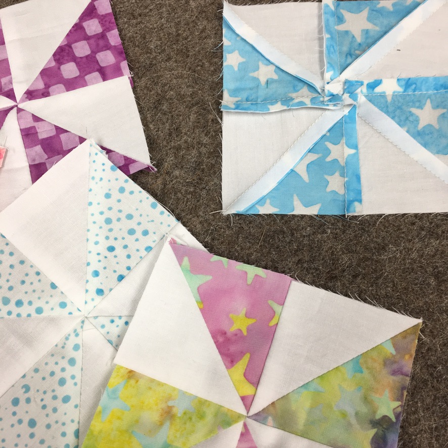 I used the Accuquilt 8″ Qube die #5 to cut all the half-square triangles. They finished at 4 1/2” x 4 1/2” and when sewn into the quilt will finish at 4″ x 4″. And yes, I twirled the centre seam!