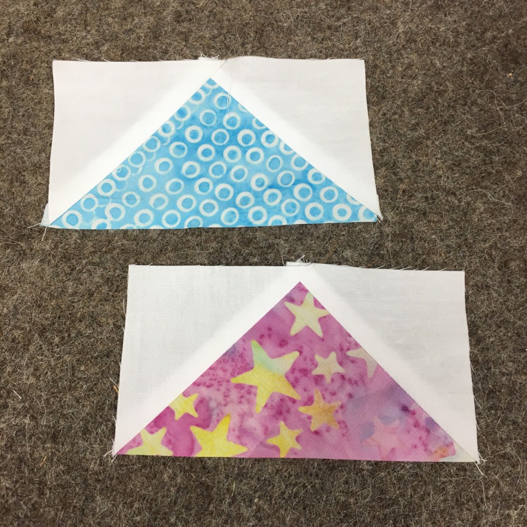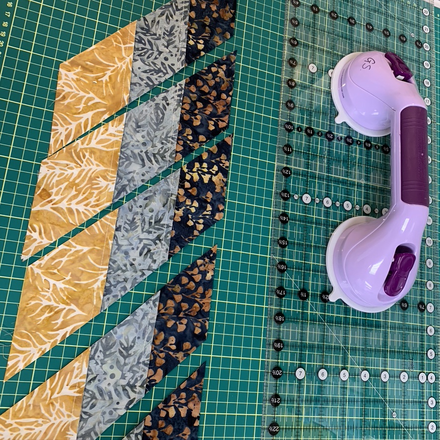 I used the Accuquilt 8″ Qube die #4 and die #5 to make the Flying Geese blocks. They finished at 2 1/2” x 4 1/2” and when sewn into the quilt will finish at 2″ x 4″.