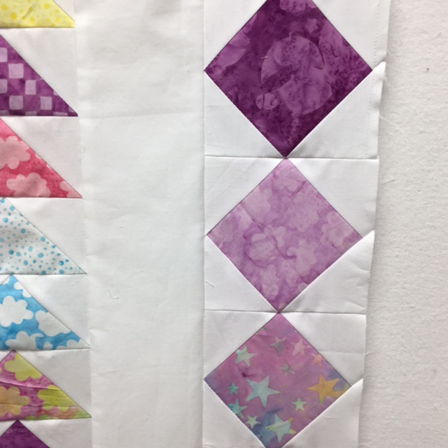 With using a huge variety of fabrics from the Baby Bloomers collection, I felt that it needed a bit of a break, so I added a 3″ border. I may fill it in with appliqué or quilting later. Anyhow, here is my quilt with the Square-in-a-square blocks added. The quilt now measures 48.5″ x 52″