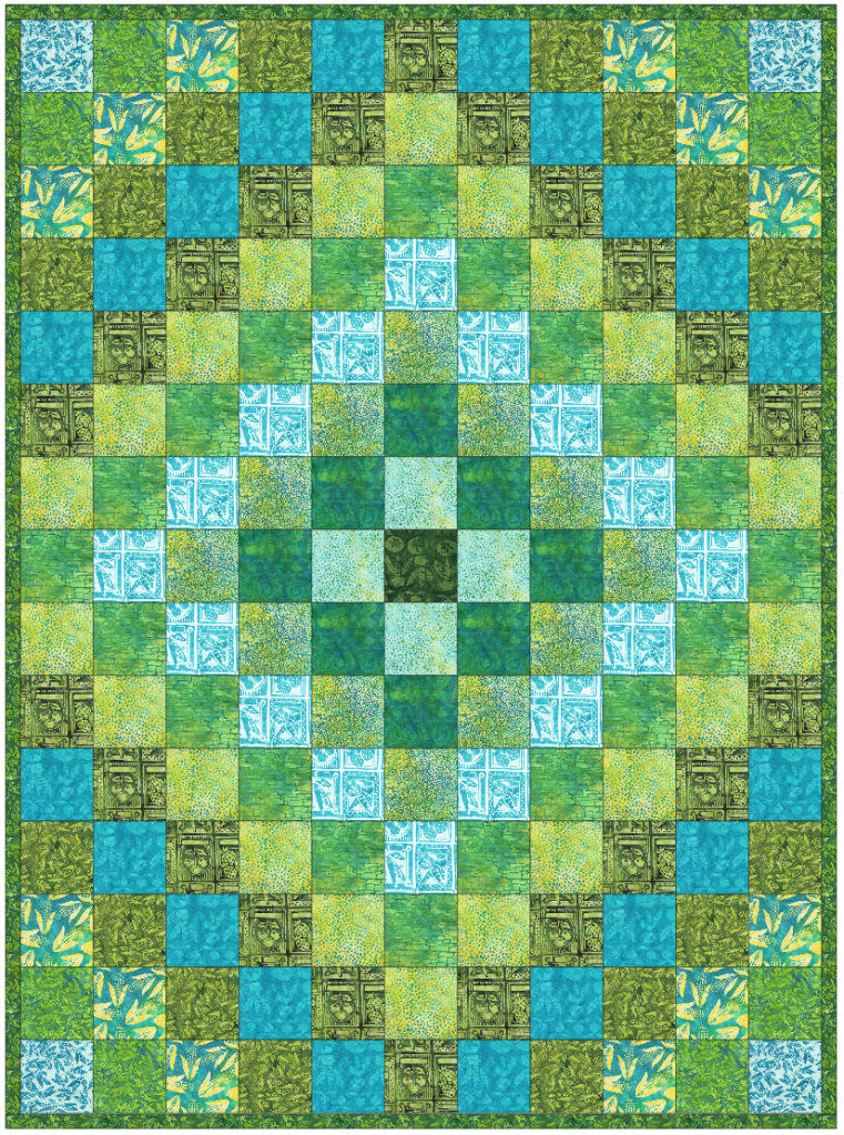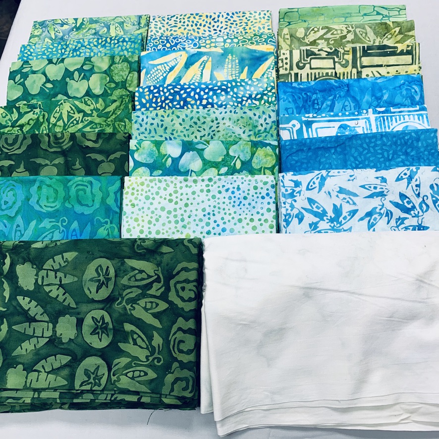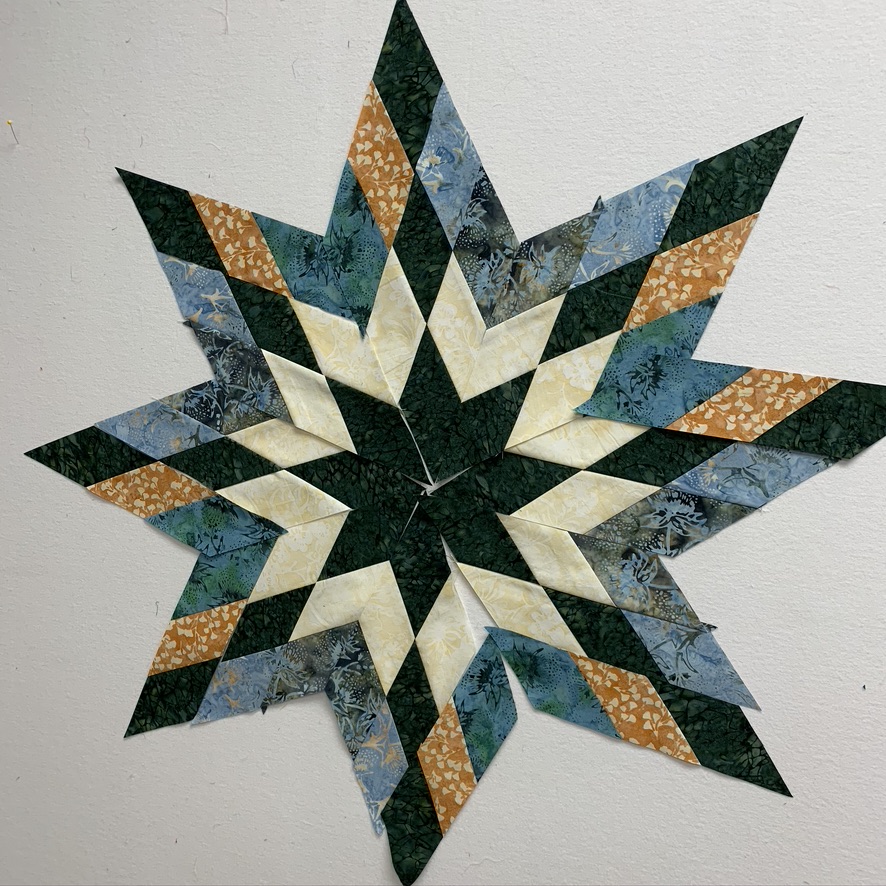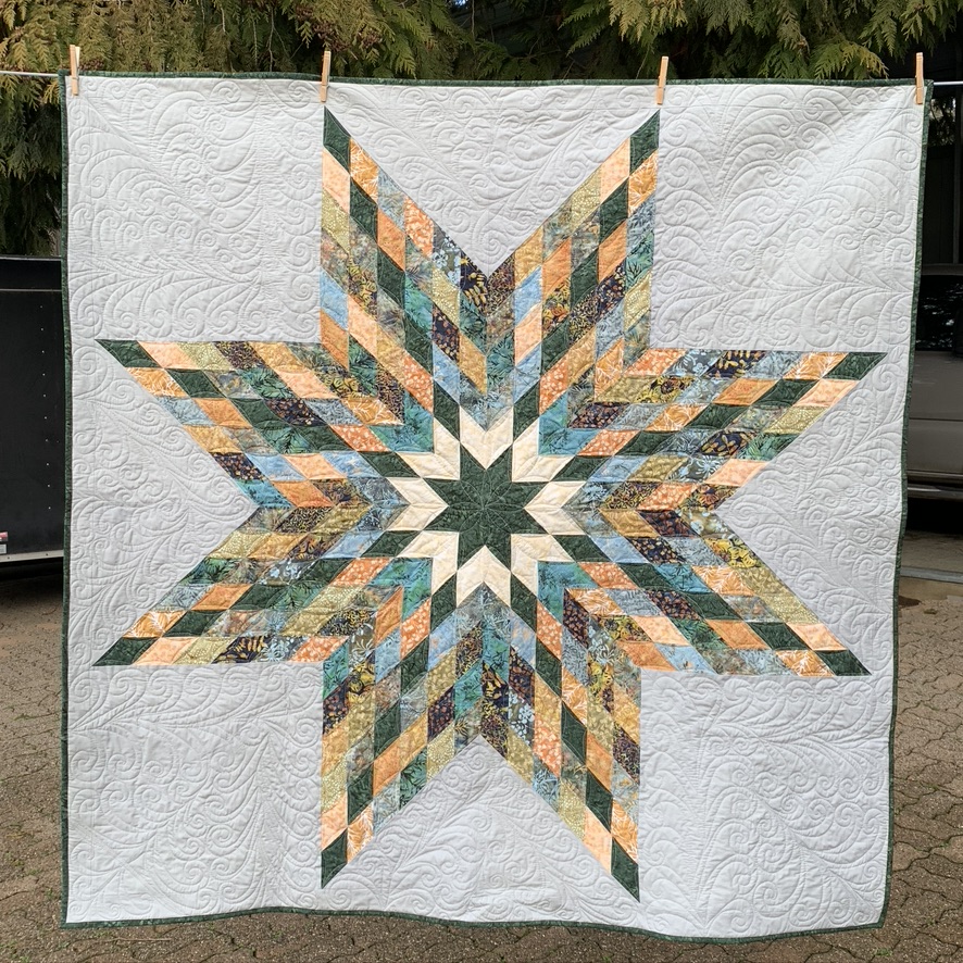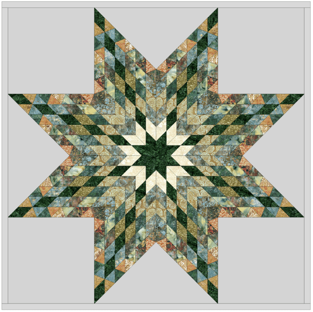 I LOVED this quilt SEW much, I went to my Island Batik pre-cuts and found a strip pack of Naturescape (by Jerry Khiev) which came with a 2 yard cut of “Large Netting – Pineneedle” (a dark green). It was the PERFECT fabric for my centre star and to radiate out to the star points.