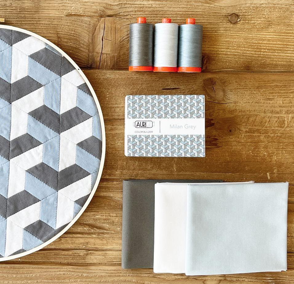 It doesn’t use a lot of fabric! I used Island Batik fabric from a Stash Builder bundle. I also used scraps of Hobbs 80/20 batting and Aurifil thread for piecing and top stitching.