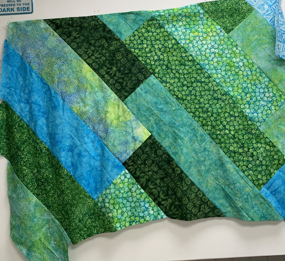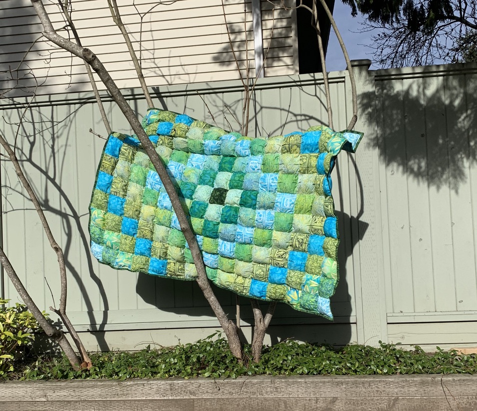 I finished quilting and binding this one day while sewing on Zoom with some friends. I rushed outside to attempt to take a picture in the sun, but the sun was gone and the wind had picked up. How I managed to get a still picture is amazing to me!