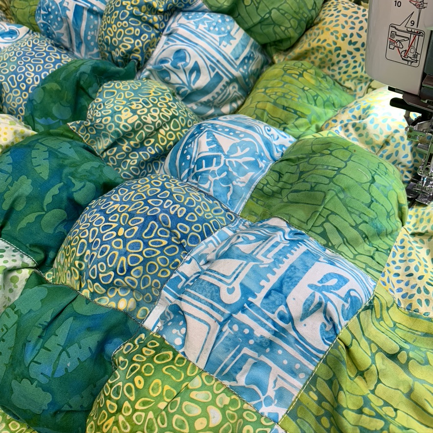 I ended up looking at many you-tube videos and a few Instagram posts to figure out how to make my Puff Quilt. The video that made the most sense to me was this one: How To Make A Puff Quilt The Easy Way ~Bubble Quilt ~ Puffer Quilt. I didn’t use a minky on the back as the video suggested … I used more of the Island Batik fabric from the collection I was given.