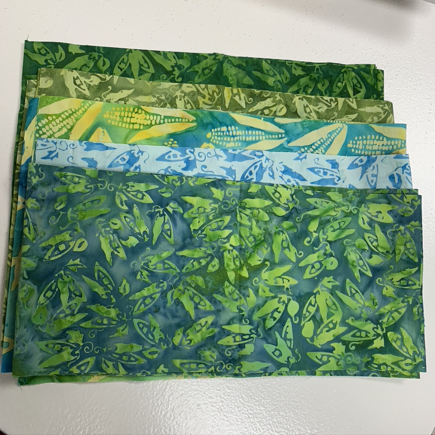 I was given “Fruit and Veggies” collection by Kathy Engle. Along with 2 yards of Veggie Garden – Green (one of the collection fabrics) and 2 yards of Mint (a foundation fabric). Isn’t it a beautiful green & blue collection?