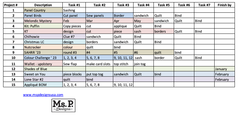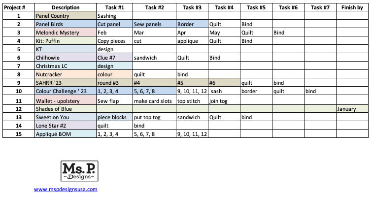 My plan is to finish the SAHRR ’23 (just binding to do) and the KT quilt – that is being made and written for an upcoming mystery! Those are the items I’ll work on for 10 – 15 minutes a day!
