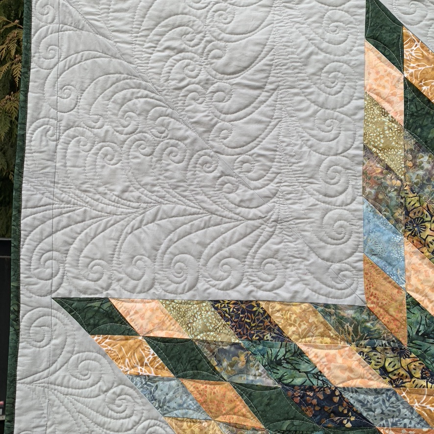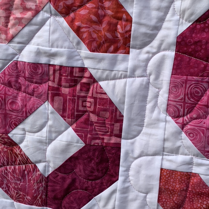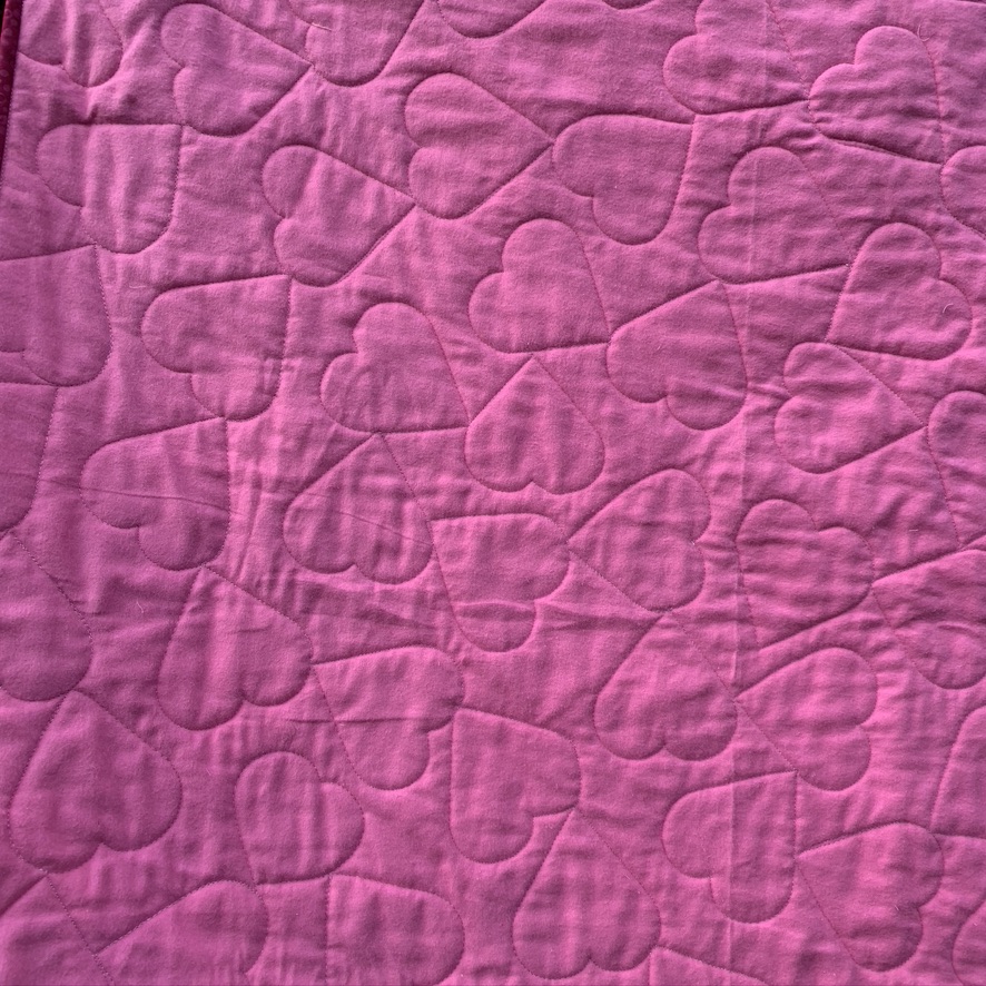 Quilted with Glide thread “Peacock” using mostly 4″ Cupid ruler (Silly Moon) with the occasional 3″ heart.