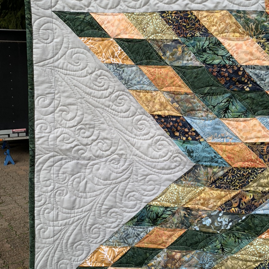 I quilted it the same as the previous lone star – with small arcs in the diamonds and fake feathers on the grey!