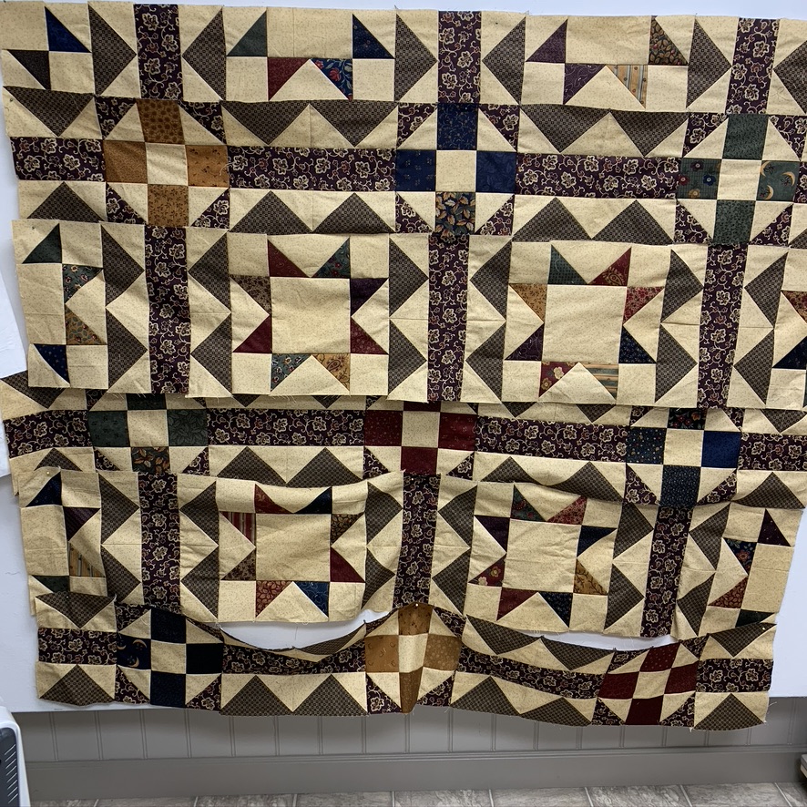 Here’s Sarah’s and she says, “Not sure what I’ll do with the hour glass blocks, but the square in a square are just what I needed for the flying geese border. “