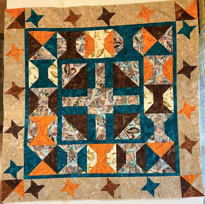To be honest, I have NO IDEA how the math worked out on this!!! The hourglass blocks were 3″ finished and the flying geese are 2″ x 4″ … and it worked out on all sides! Boggles my mind!